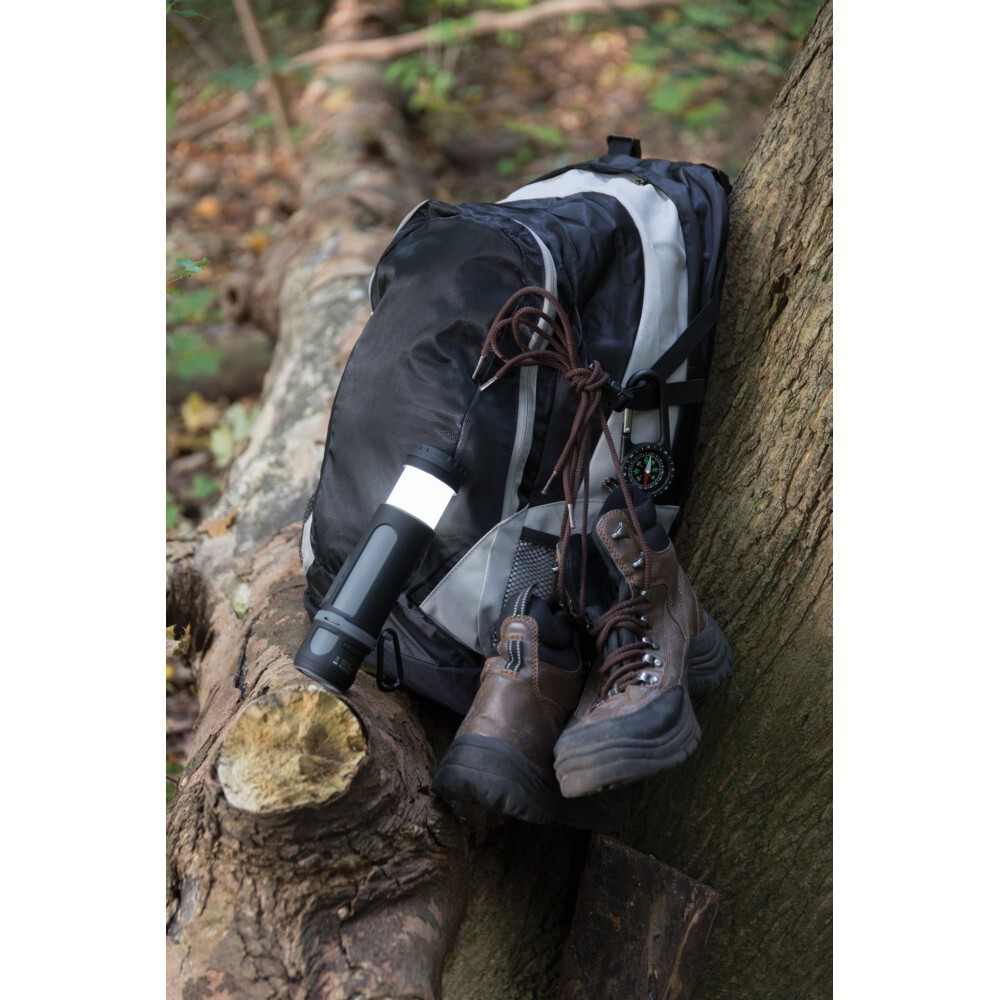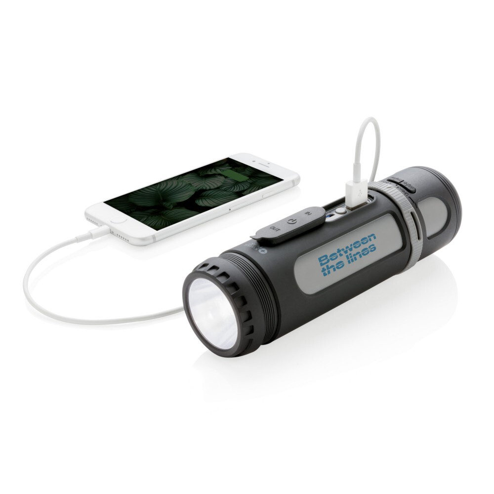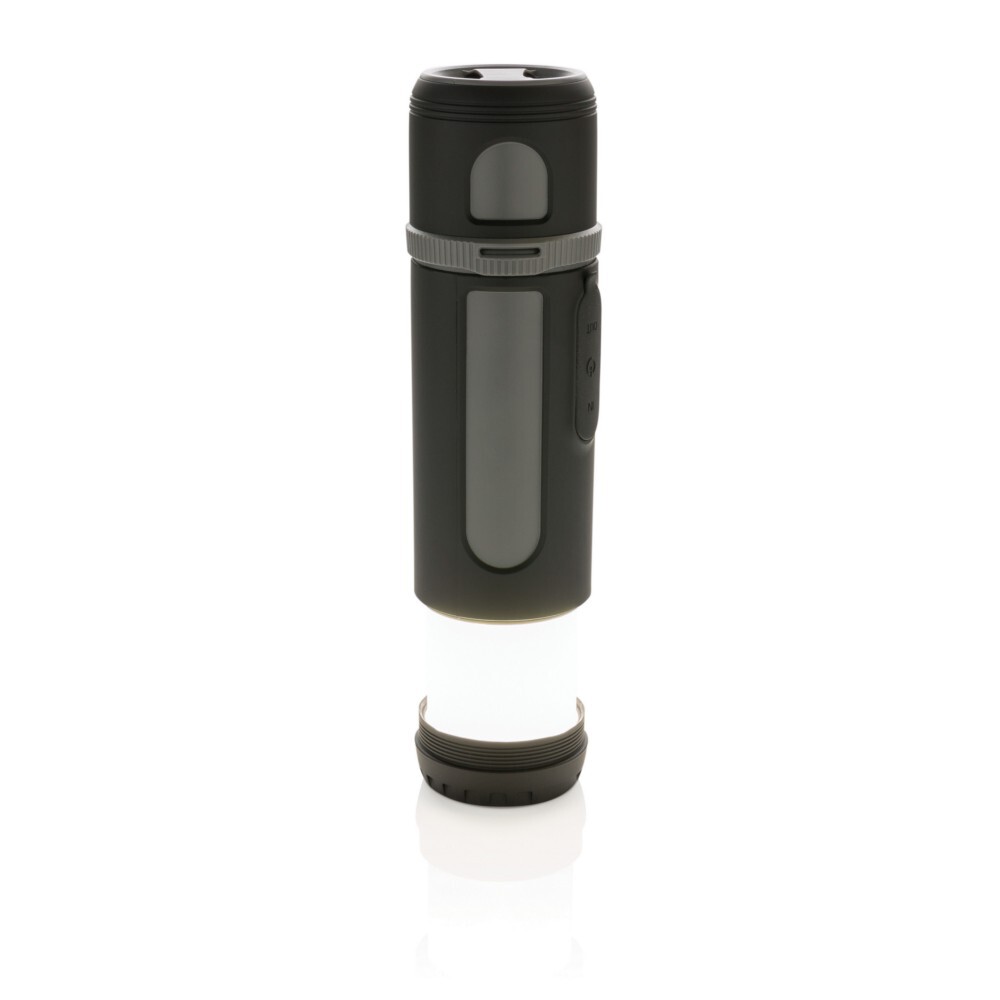 Głośnik bezprzewodowy 3W, power bank 4400 mAh, wejście 2A, wyjście 5V/2A, lampka kempingowa LED z jasnym światłem 200-250 lm, latarka z 4 trybami świecenia (standardowy, silny, słabszy i migający), wbudowany akumulator umożliwia odtwarzanie muzyki do 18 godzin na jednym naładowaniu, kabel micro USB i karabińczyk w komplecie