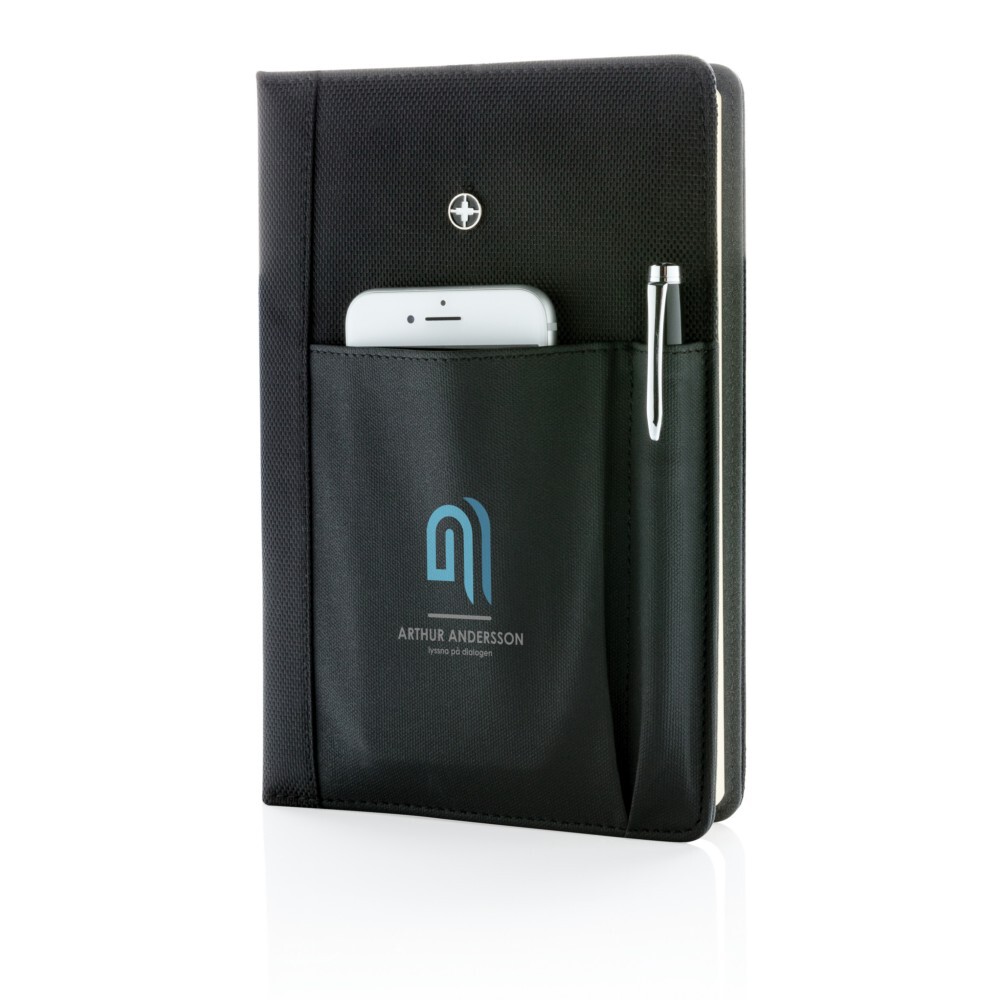 Notatnik (ok. A5, 96 kartek 80 g/m2), długopis, okładka wielokrotnego użytku wykonana z poliestru 1680D i 600D, kieszonka na telefon lub inne drobne akcesoria, w pudełku podarunkowym Swiss Peak