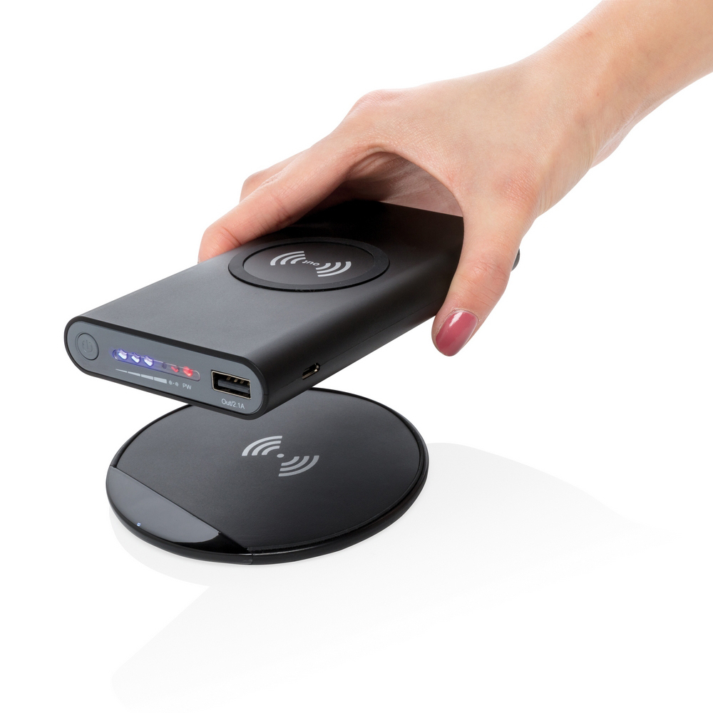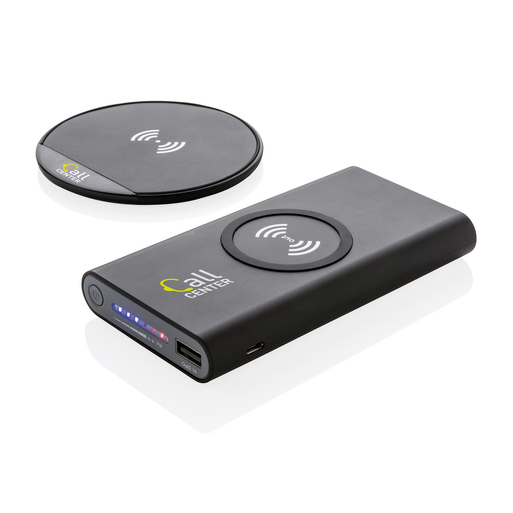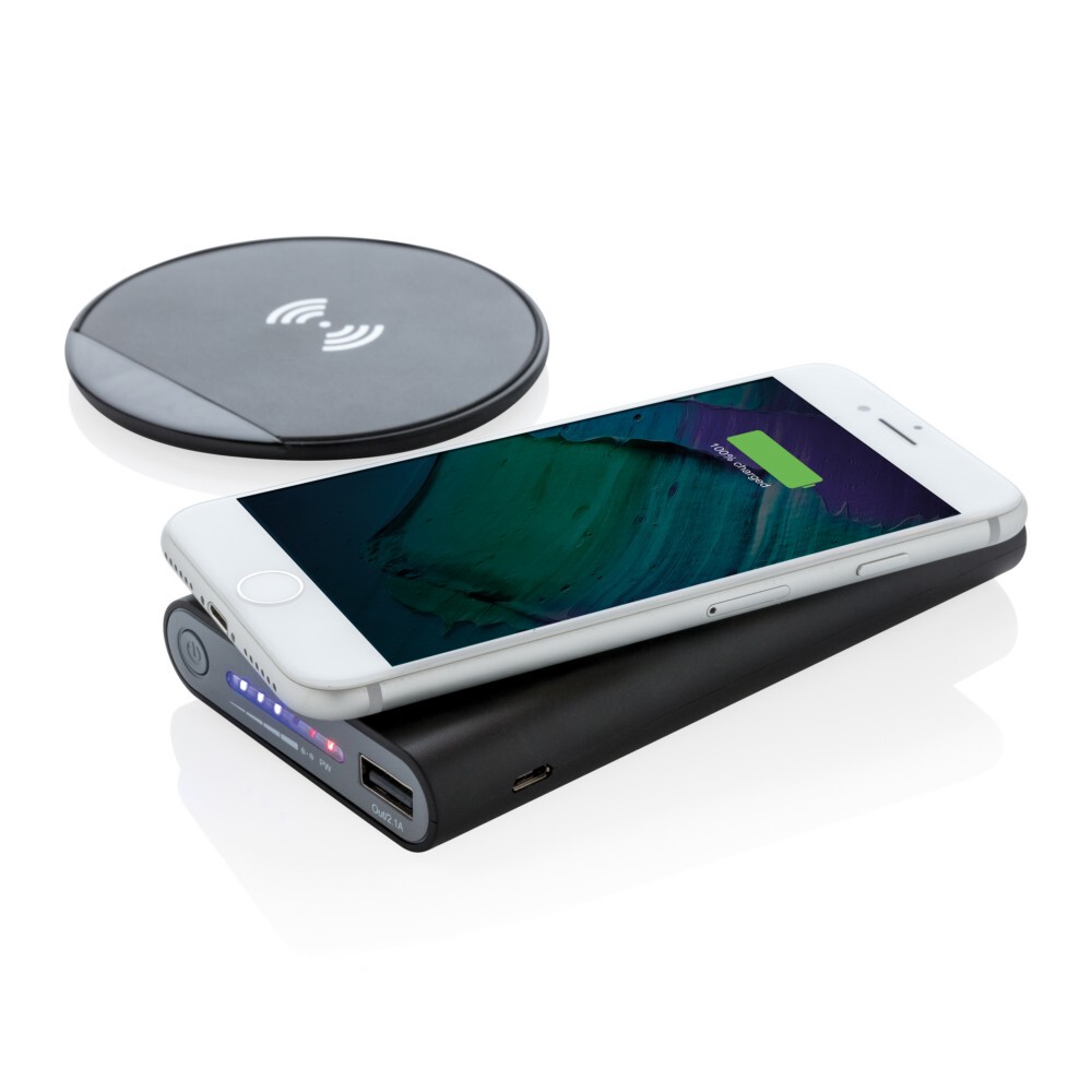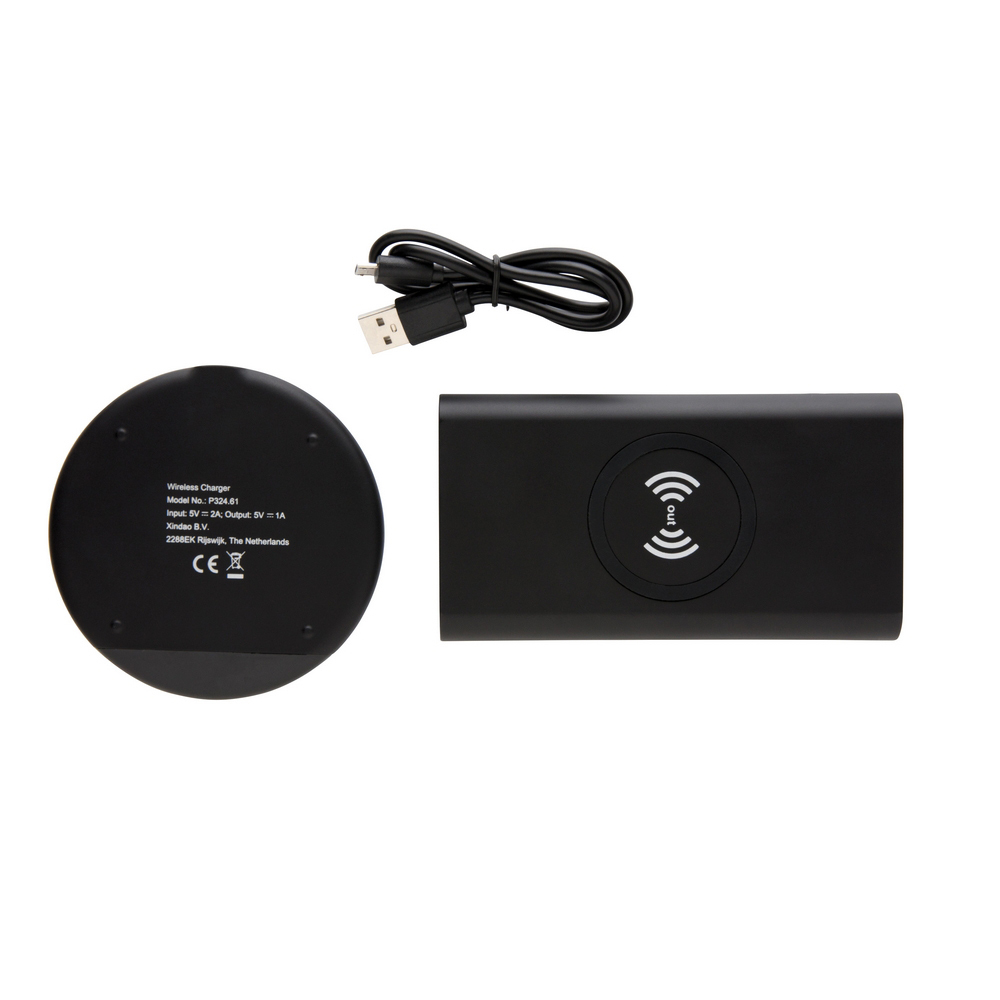 Zestaw podarunkowy do ładowania bezprzewodowego, bezprzewodowy power bank 8000 mAh z 2 portami USB (w tym USB typu C) do ładowania za pomocą kabla, ładowarka bezprzewodowa 5W, power bank można łatwo naładować umieszczając go na ładowarce bezprzewodowej, ładowarka może również być używana oddzielnie do ładowania telefonu, bezprzewodowe ładowanie jest kompatybilne ze wszystkimi urządzeniami posiadającymi możliwość ładowania indukcyjnego, power bank: wejście 5V/2.1A, wyjście 5V/2A, wyjście bezprzewodowe 5V/1A, ładowarka bezprzewodowa: wejście 5V/2A, wyjście 5V/1A 5W, kabel micro USB w komplecie