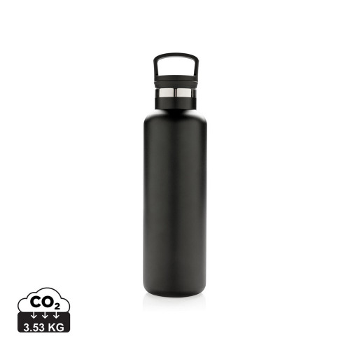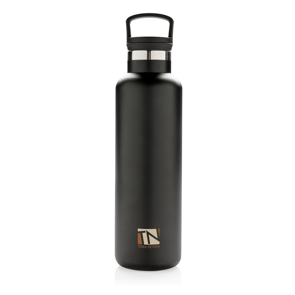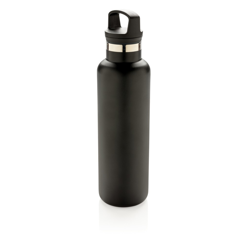 Próżniowa butelka sportowa 600 ml, proszkowa powłoka, podwójne ścianki, nakrętka 2 w 1 z sitkiem do zaparzania herbaty lub dodawania do wody owoców i ziół, ustnik do sączenia napojów i dodawania kostek lodu, wewnątrz stal nierdzewna 304, stal nierdzewna 201 na zewnątrz, utrzymuje temperaturę ciepłych napojów do 5 godzin oraz zimnych do 15 godzin