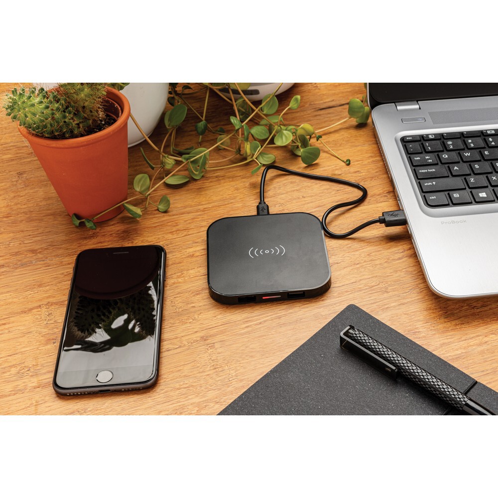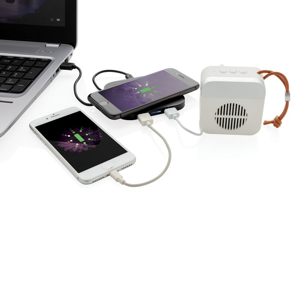 Ładowarka bezprzewodowa 5W, wykonana z ABS, dwa wyjścia USB do ładowania telefonów starszej generacji za pomocą kabla, bezprzewodowe ładowanie jest kompatybilne ze wszystkimi urządzeniami posiadającymi możliwość ładowania indukcyjnego, wejście 1A, wyjście USB 5V/1A, wyjście bezprzewodowe 5W
