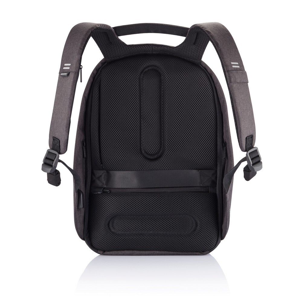 Plecak chroniący przed kieszonkowcami Bobby Hero XL, wodoodporny i odporny na przecięcia materiał, wykonany z przyjaznego środowisku materiału rPET, ukryte zamki i kieszenie, wewnątrz miękkie przegrody na laptopa do 17" i tablet do 12,9", zintegrowany port USB do ładowania telefonów (power-bank nie jest dołączony), odblaskowe paski zwiększające widoczność, pasek do zamocowania na walizce, wzór zastrzeżony®