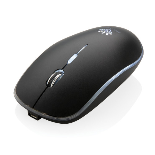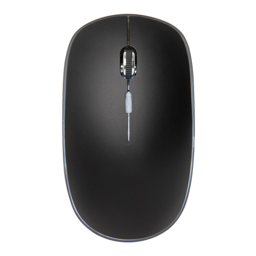 Bezprzewodowa mysz komputerowa, szybkie połączenie 125 Hz, przycisk do zmiany czułości działania, wbudowany akumulator litowo polimerowy o pojemności 300 mAh, ponowne ładowanie w 3 godziny, nadajnik USB w komplecie, grawer ukazuje podświetlaną powierzchnię