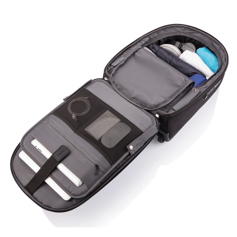 Bobby, plecak na kółkach chroniący przed kieszonkowcami, wykonany z materiałów pochodzących z recyklingu, teleskopowy uchwyt, chowane paski na ramiona, osłona na koła zapobiegająca ubrudzeniu, zintegrowany port USB do ładowania telefonów (power-bank nie jest dołączony), przestronna przegroda główna zamykana na zamek cyfrowy TSA®, wiele kieszeni wewnątrz, przegroda na laptopa do 17", kieszeń z ochroną RFID, rozmiar bagażu podręcznego, wzór zastrzeżony®