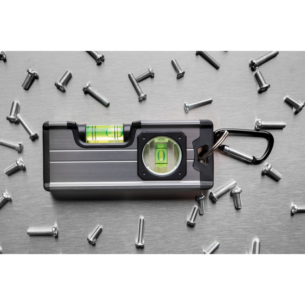 Poziomica, długość 12 cm, 2 płaszczyzny pomiaru, obudowa wykonana z aluminium, wbudowany magnes, z karabińczykiem