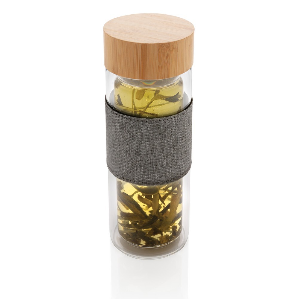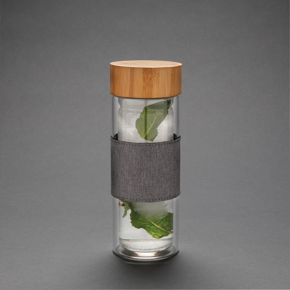 Szklana butelka sportowa 360 ml w pokrowcu, pokrowiec z rPET, podwójne ścianki ze szkła borokrzemowego odpornego na wysoką temperaturę, nie zawiera BPA, wzór zastrzeżony®