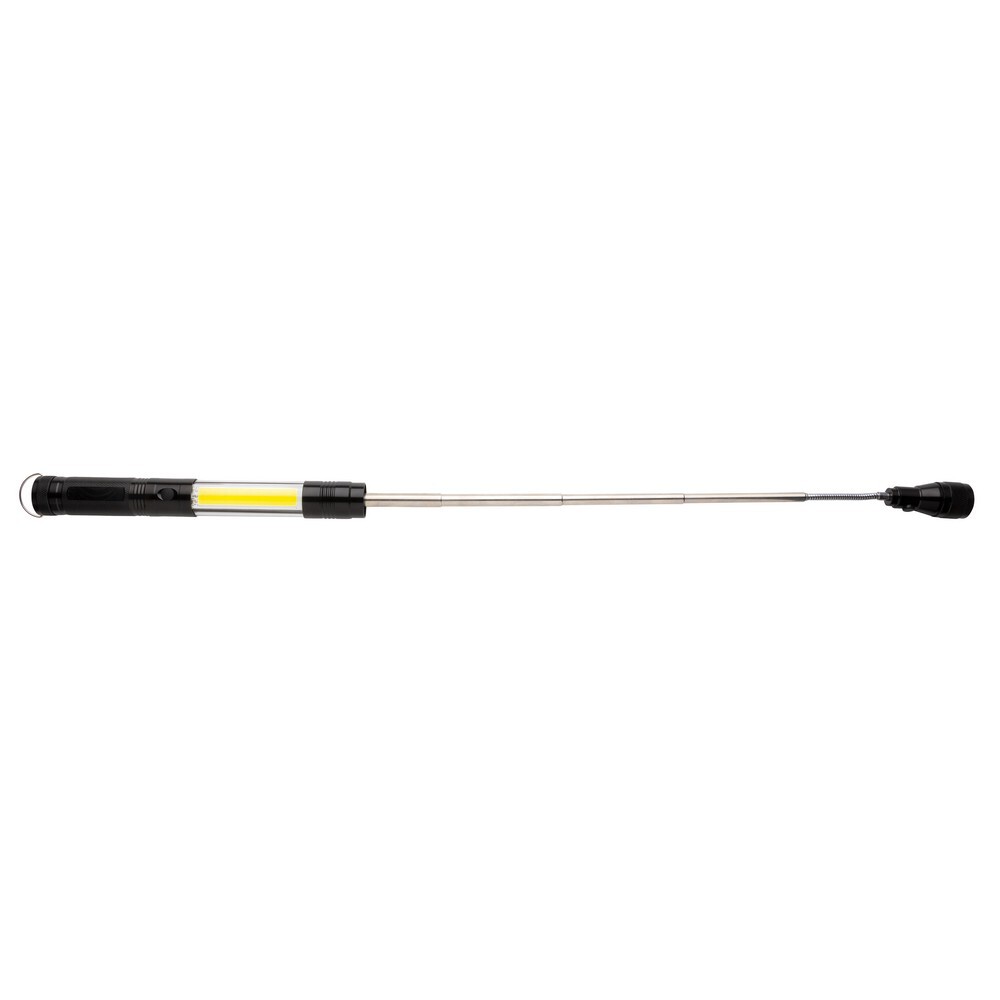 Teleskopowa latarka COB, obudowa wykonana z aluminium, elastyczna, wysuwana końcówka wyposażona jest w 3 diody LED oraz magnes do wyciągania przedmiotów z trudno dostępnych miejsc, z boku jasne światło COB 80 lumenów, baterie w komplecie