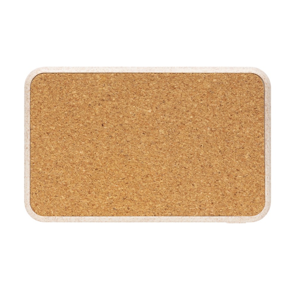 Power bank 5000 mAh, 4 diody wskazujące poziom naładowania, górna część wykonana z naturalnego korka, obudowa z mieszanki 35% słomy pszenicznej i ABS, wbudowany akumulator litowo-polimerowy klasy A o dużej gęstości i trwałości pozwala na naładowanie telefonu do 3 razy, wejście USB typu C 5V/2A, wejście micro USB 5V/2A, wyjście 5V/2A, nie zawiera PVC
