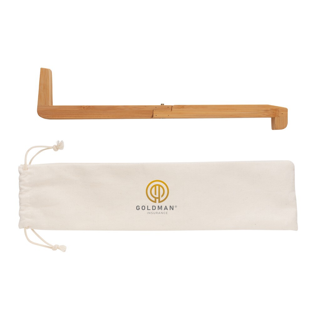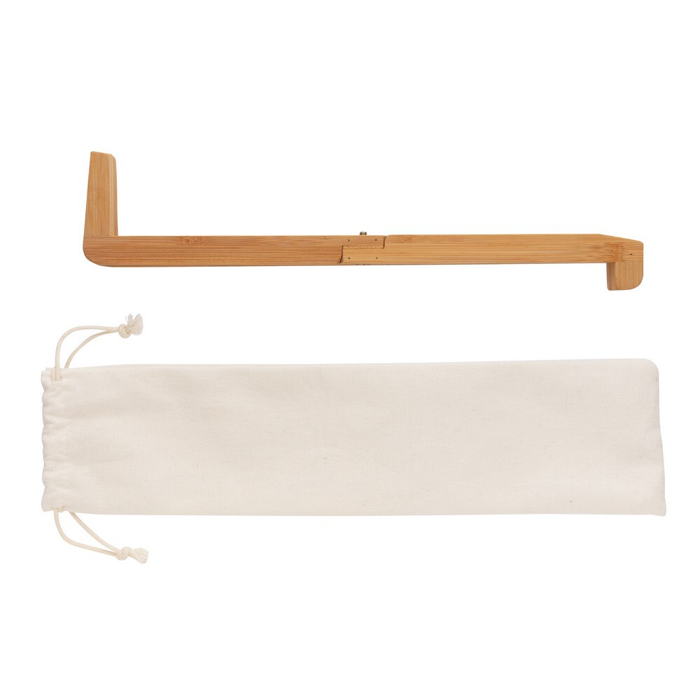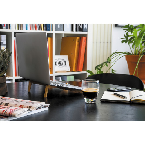 Składany stojak na laptopa, tablet, wykonany z wytrzymałego, naturalnego bambusa, podstawka zapewnia odpowiedni poziom cyrkulacji powietrza pod urządzeniem oraz właściwe położenie ekranu, kompatybilny z laptopami do 15,6", może również służyć jako stojak na książkę, bawełniane etui w komplecie