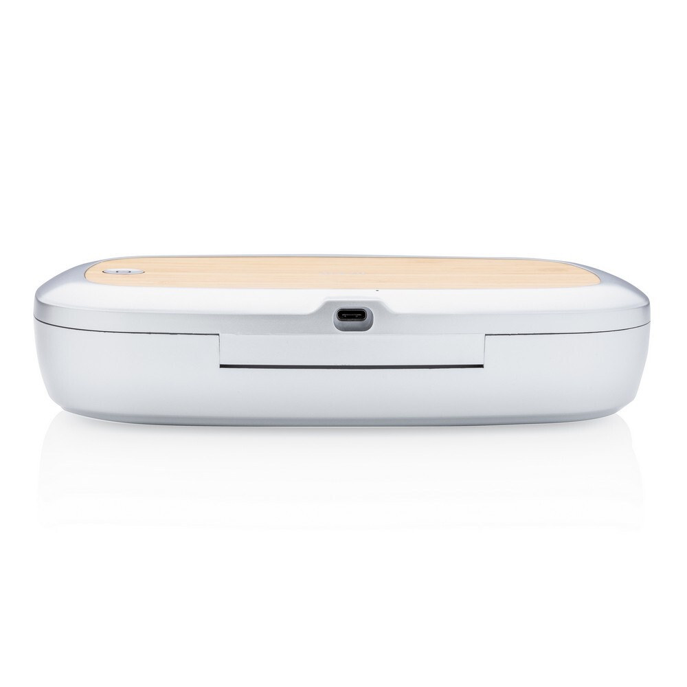 Urządzenie do sterylizacji UV-C, ładowarka bezprzewodowa 5W z bambusowym elementem, urządzenie zabija 99,9% bakterii na umieszczonych wewnątrz przedmiotach takich jak zegarki, telefony, słuchawki, biżuteria, itp., 2 tryby sterylizacji, szybka (90 sekund), sterylizacja całkowita (5 minut), dzięki specjalnej konstrukcji po otwarciu urządzenia w trakcie sterylizacji światło wyłączy się automatycznie, bez narażania użytkownika, 2 nietoksyczne i wykonane bez dodatku rtęci światła LED UV-C, cykl życia lamp do 10000 godzin, bezprzewodowe ładowanie jest kompatybilne ze wszystkimi urządzeniami posiadającymi możliwość ładowania indukcyjnego, wejście 5V/2A, wyjście 5V/1A 5W, 100 cm kabel USB typu C z TPE bez dodatku PVC w komplecie