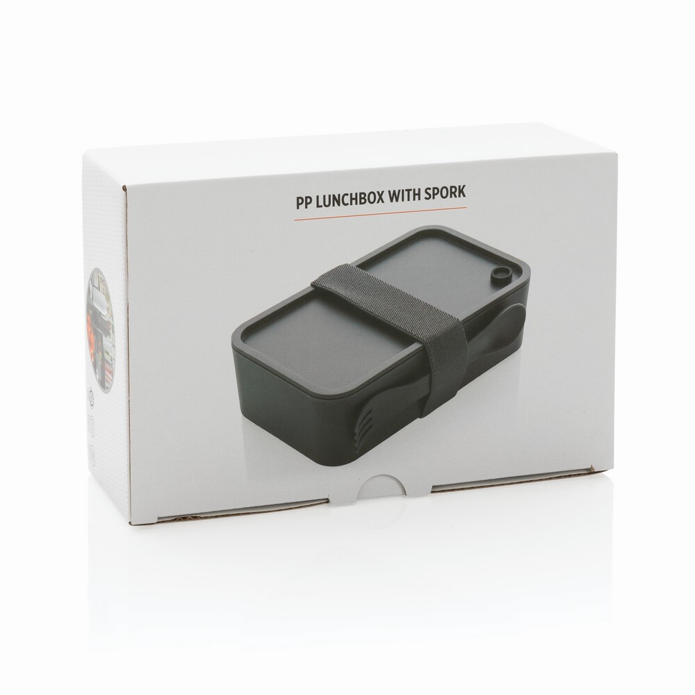 Pudełko śniadaniowe, lunchbox o pojemności 1200 ml, wykonane z PP, w komplecie łyżkowidelec i elastyczny pasek, można myć w zmywarce i używać w kuchence mikrofalowej