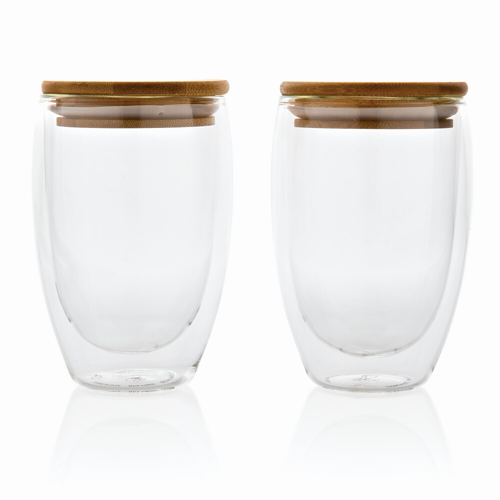 Zestaw szklanek 350 ml, 2 szt., bambusowe wieczko, podwójne ścianki, wykonana ze szkła borokrzemowego, dzięki dwuściankowej konstrukcji widać napój w środku, a zewnętrzna ścianka nie nagrzewa się, zaleca się mycie ręczne, nie zawiera BPA