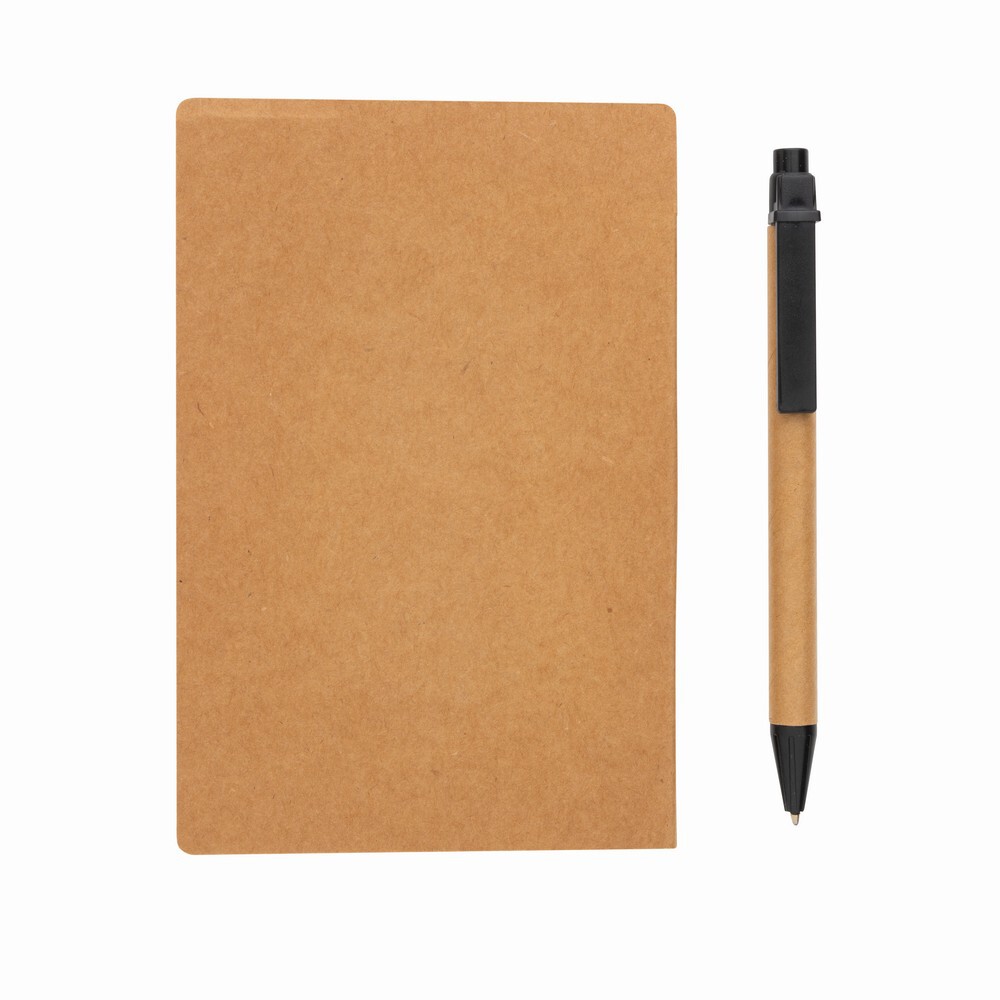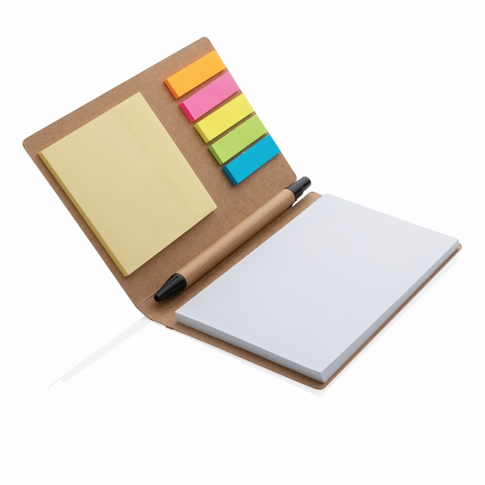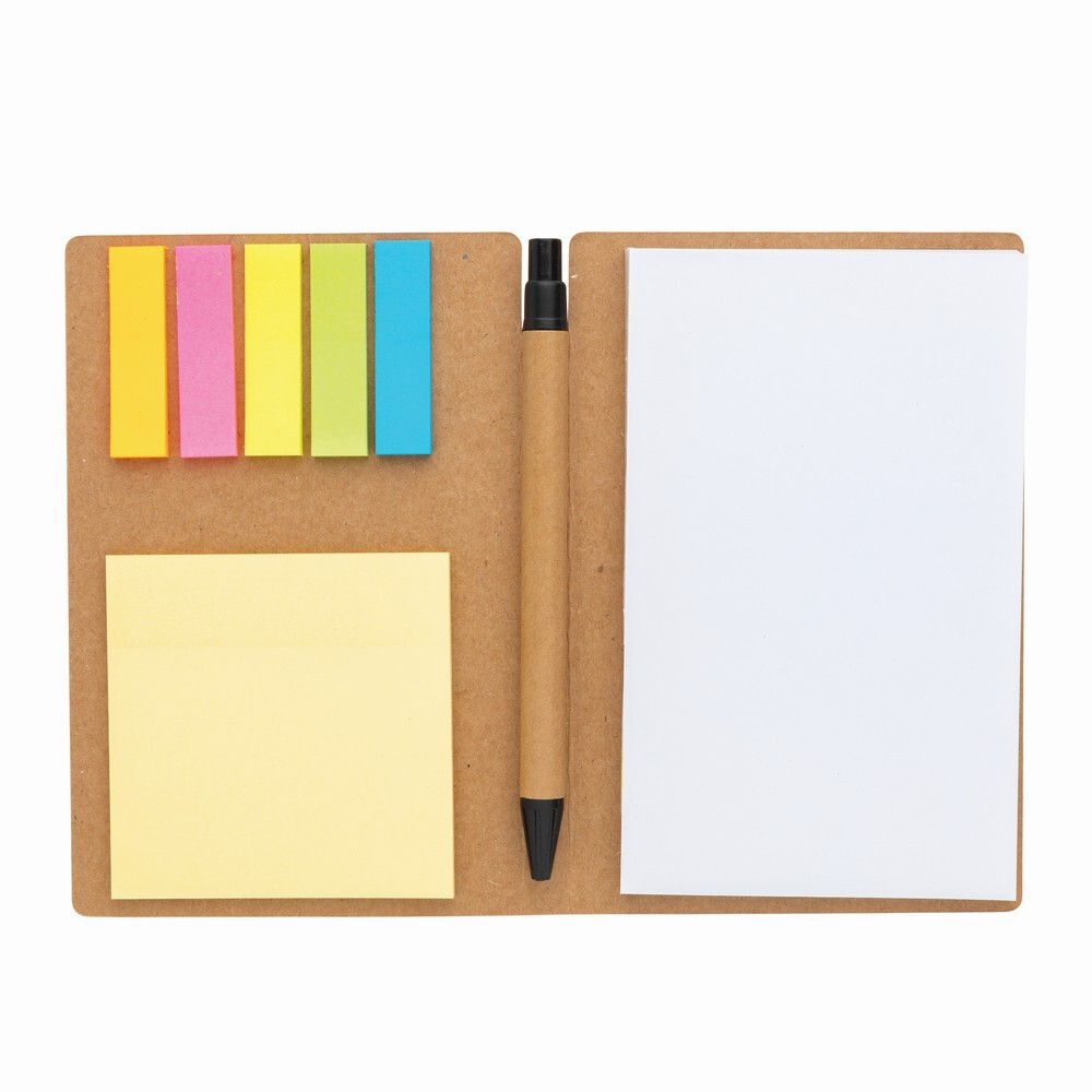 Zestaw do notatek, karteczki samoprzylepne, w zestawie mały długopis wykonany z papieru z recyklingu i ABS, niebieski tusz, długość pisania do 800 m, okładka z papieru kraftowego o gramaturze 350 g/m2, wewnątrz bloczek większych karteczek 50 szt., oraz 4 małe bloczki i jeden średni zawierające 25 kartek każdy