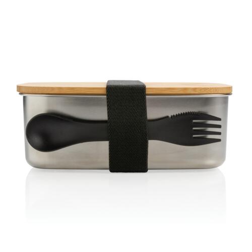 Pudełko śniadaniowe z bambusowym wieczkiem, łyżkowidelec / Srebrny