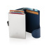 Portfel, etui na karty kredytowe z ochroną RFID, wykonany z wytrzymałego aluminium, mieści do 7 kart lub do 5 z tłoczeniem, posiada suwak boczny do wysuwania kart, miejsce na gotówkę w portfelu