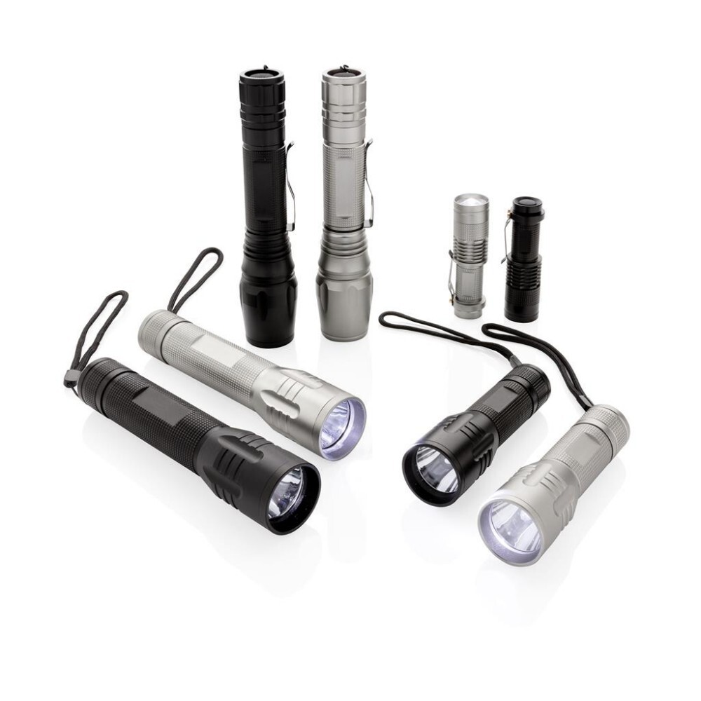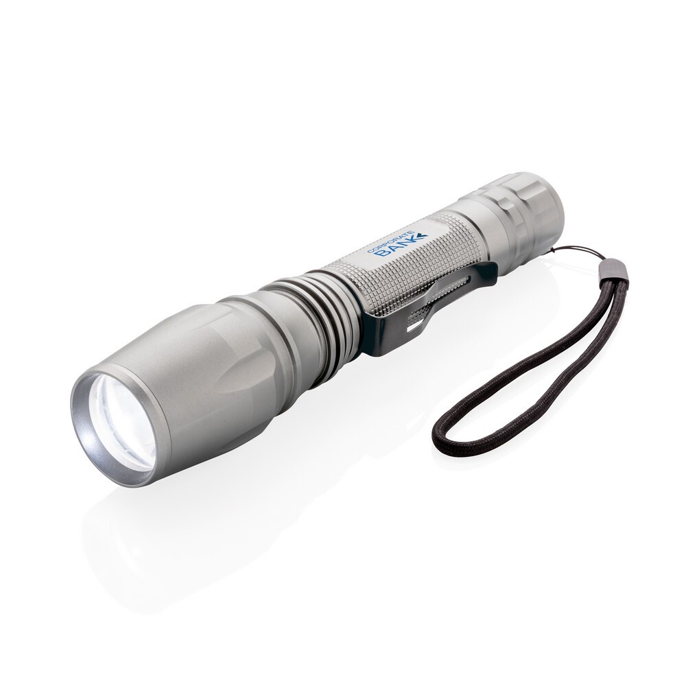 Latarka CREE LED 10W o bardzo jasnym świetle, wykonana z aluminium, 250 lumenów, wytrzymała, wodoodporna (IPX4) i wstrząsoodporna (upuszczenie nawet z 1 metra), funkcja zoom, klip do paska, czas pracy do 6 godzin, baterie w komplecie