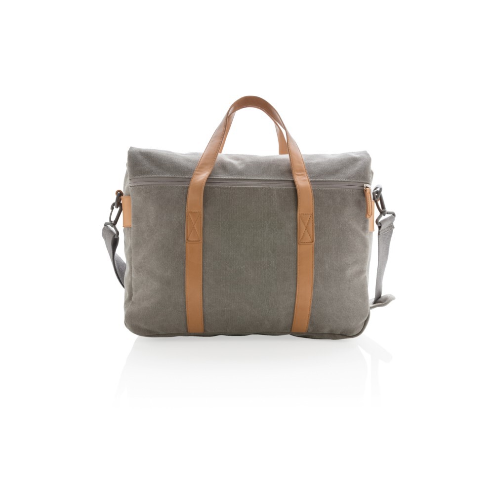Torba na laptopa 15,6"', wykonana z naturalnego i wytrzymałego płótna oraz imitacji skóry, wewnątrz miejsce na dokumenty, tablet i inne akcesoria, regulowany i odpinany pasek na ramię w komplecie, nie zawiera PVC