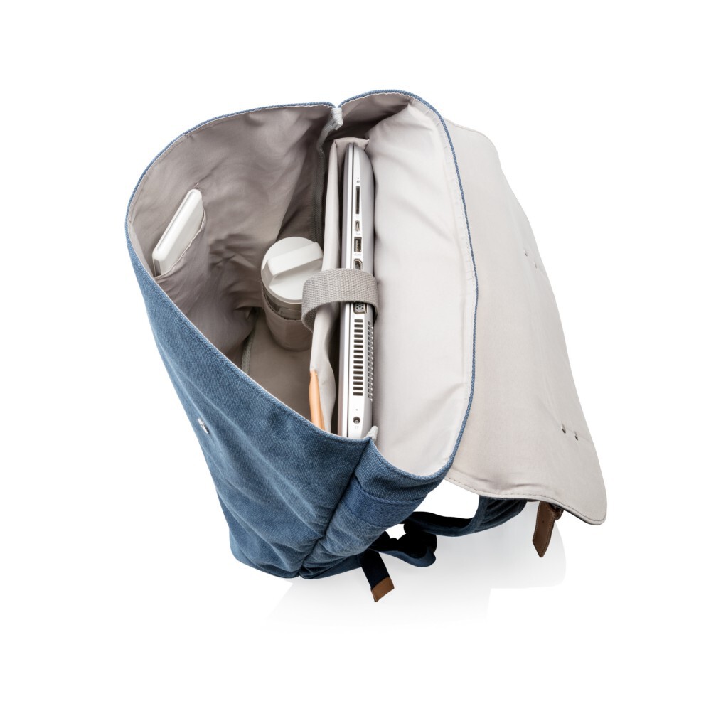 Plecak z miękką przegrodą na laptopa 15,6", wykonany z wytrzymałego płótna, pokrywa górna zamykana na paski z magnetycznymi klamrami, nie zawiera PVC