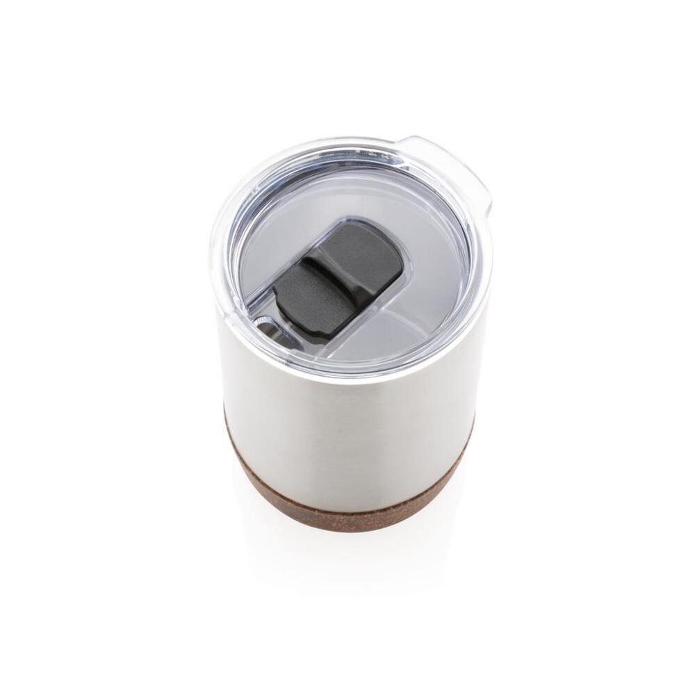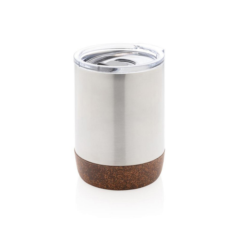 Korkowy kubek termiczny 180 ml, podwójne ścianki ze stali nierdzewnej z próżnią między ściankami, wewnątrz stal nierdzewna 304, na zewnątrz stal nierdzewna 201, utrzymuje napoje ciepłe do 5 godzin oraz zimne do 15 godzin, korkowa podstawa, pasuje do większości ekspresów do kawy