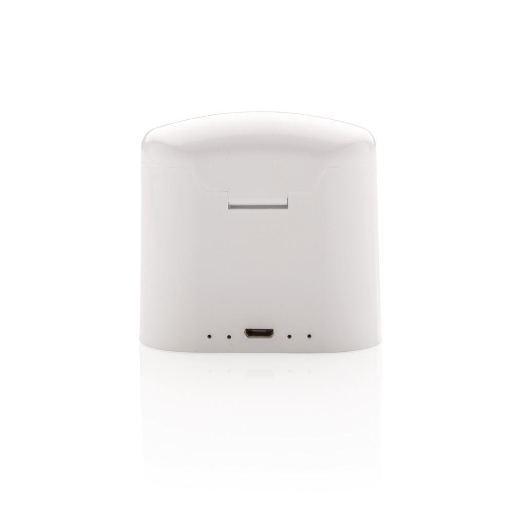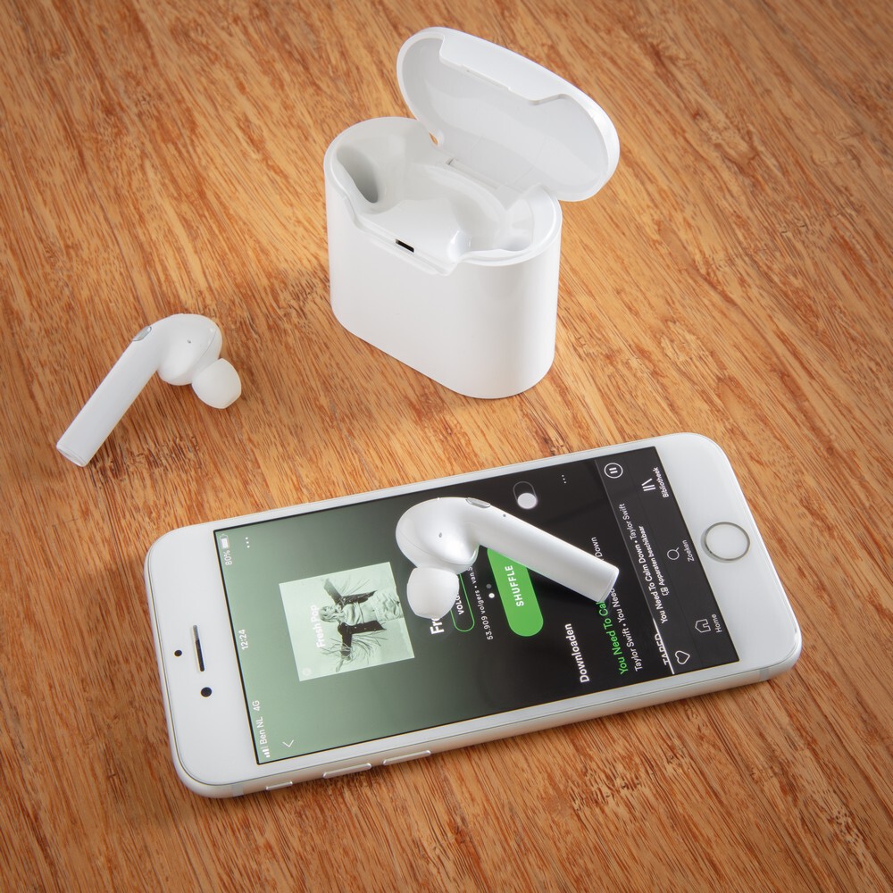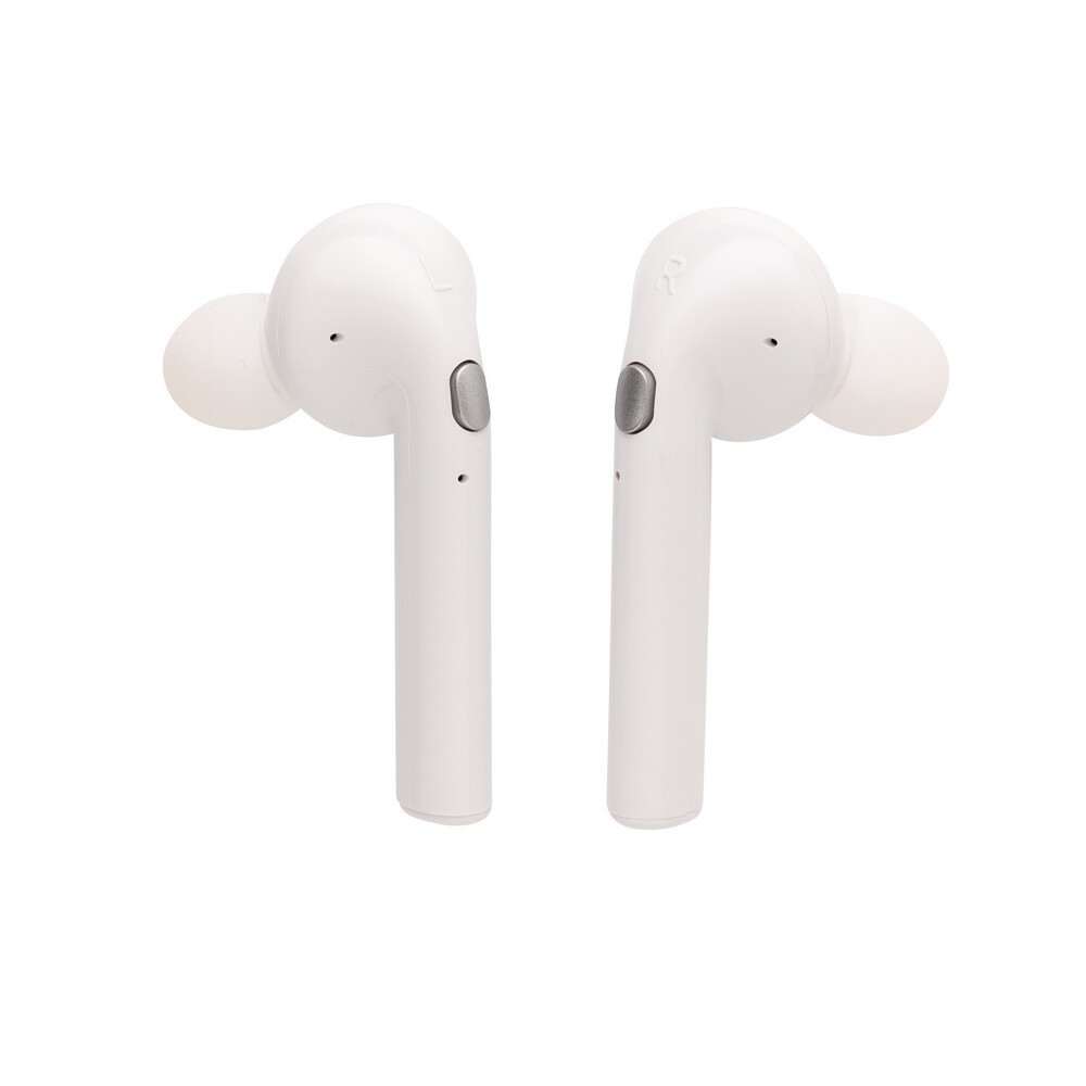 Bezprzewodowe słuchawki duszne, BT 5.0, wykonane z ABS, wbudowany mikrofon, etui z akumulatorem 400 mAh pełniące funkcję stacji ładującej w komplecie, akumulator słuchawek o pojemności 40 mAh umożliwia odtwarzanie muzyki na średnim poziomie głośności do 2 godzin, ponowne naładowanie za pomocą etui w 1 godzinę, zasięg do 10 m, 3 rozmiary nakładek dousznych w komplecie
