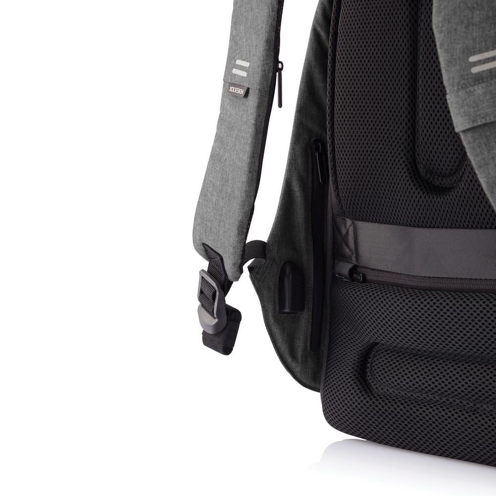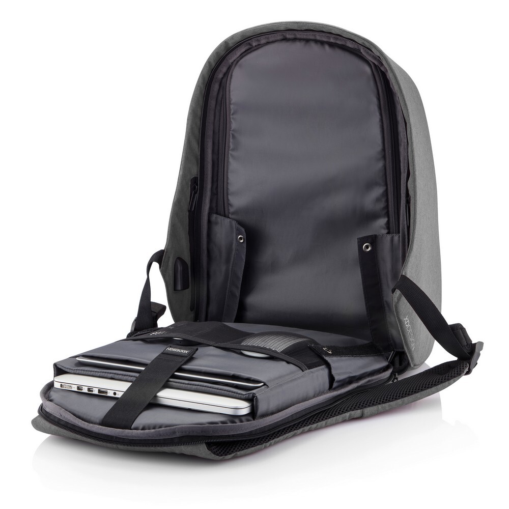 Plecak chroniący przed kieszonkowcami Bobby Hero Regular, wodoodporny i odporny na przecięcia materiał, wykonany z materiału rPET, ukryte zamki i kieszenie, wewnątrz miękkie przegrody na laptopa 15,6" i tablet do 12,9", zintegrowany port USB do ładowania telefonów (power-bank nie jest dołączony), odblaskowe paski zwiększające widoczność, pasek do zamocowania na walizce, wzór zastrzeżony®