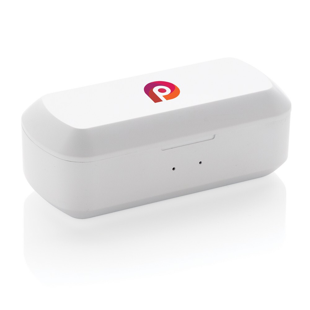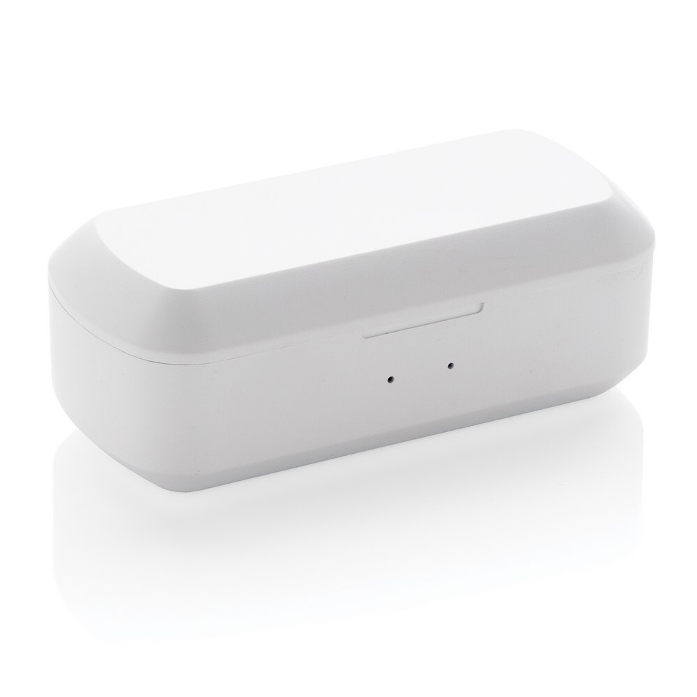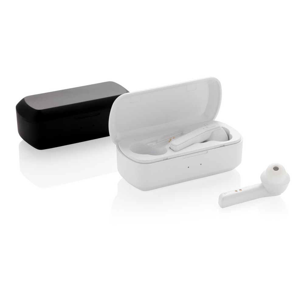 Bezprzewodowe słuchawki douszne stereo, BT 5.0, wbudowany mikrofon, funkcja odbierania połączeń, wykonane z ABS etui z akumulatorem 500 mAh pełniące funkcję stacji ładującej w komplecie, akumulator słuchawek o pojemności 35 mAh umożliwia odtwarzanie muzyki na średnim poziomie głośności do 3 godzin, ponowne naładowanie za pomocą etui w 1 godzinę, zasięg do 10 m, 3 rozmiary nakładek dousznych w komplecie