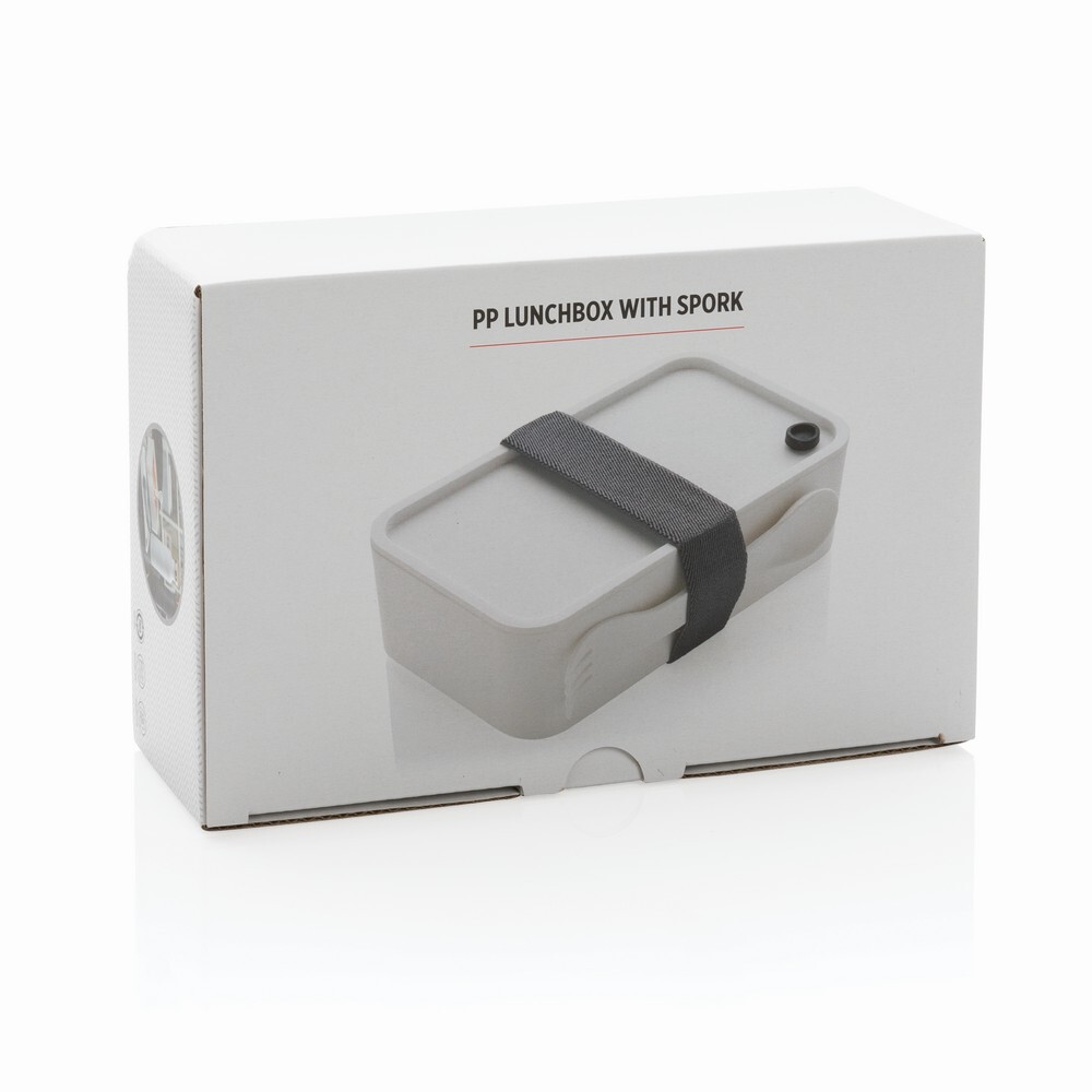 Pudełko śniadaniowe, lunchbox o pojemności 1200 ml, wykonane z PP, w komplecie łyżkowidelec i elastyczny pasek, można myć w zmywarce i używać w kuchence mikrofalowej