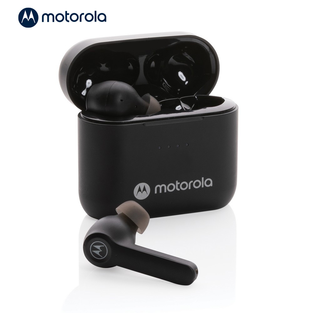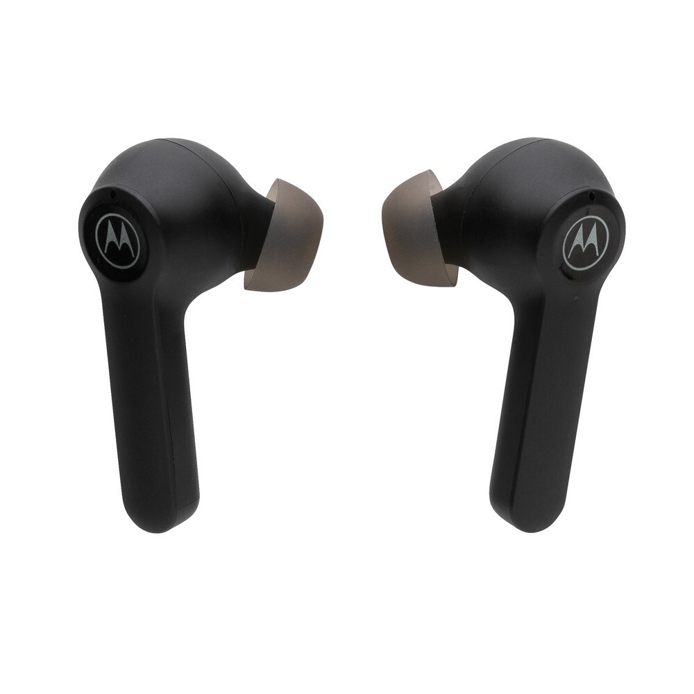 Douszne słuchawki bezprzewodowe Motorola BT 2.0, funkcja redukcji szumów ANC do 25 dB, funkcja odbierania połączeń, panel dotykowy, do 18 godzin odtwarzania w połączeniu z etui ładującym, kompatybilne z asystentami głosowymi (Siri®, asystent Google™, Alexa)