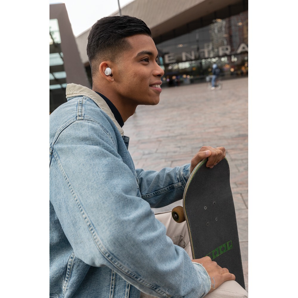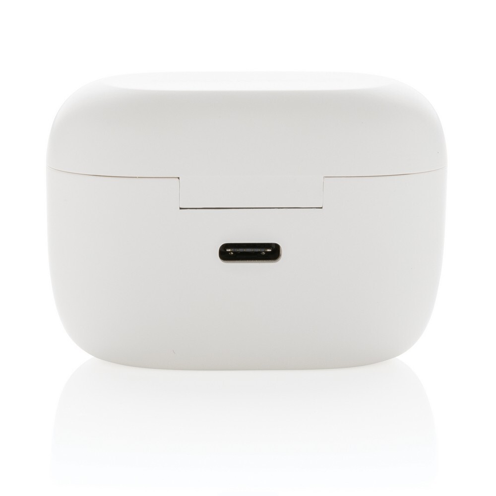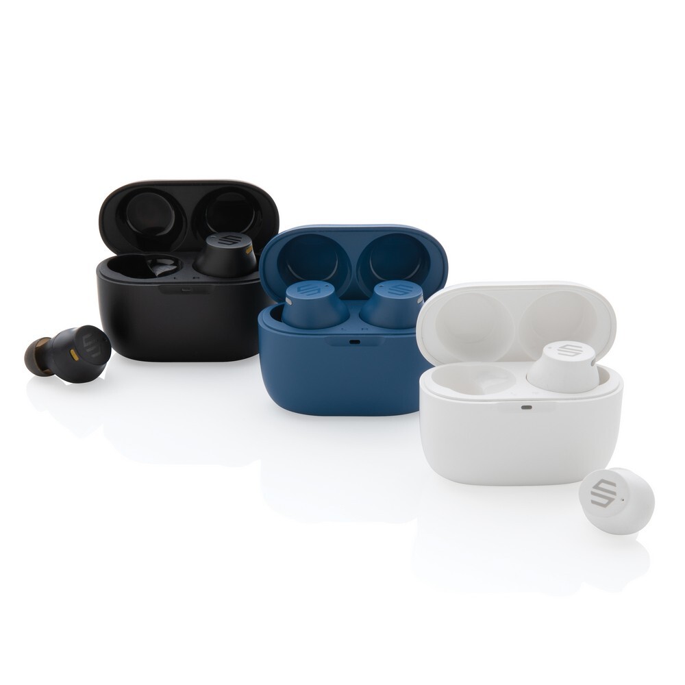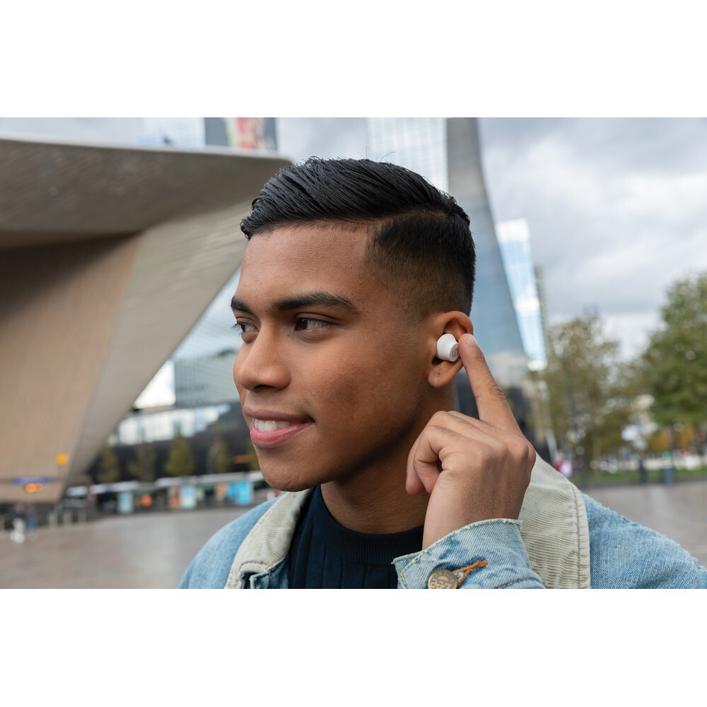 Bezprzewodowe słuchawki douszne, mocny i głęboki dźwięk, poziom redukcji szumów do 25 dB, wodoodporne IPX5, dotykowy panel sterowania, wbudowany mikrofon, funkcja odbierania połączeń, do 5 godzin odtwarzania na jednym ładowaniu, etui ładujące zapewnia 18 godzin odtwarzania, nie zawiera PVC, opakowanie nie zawiera plastiku