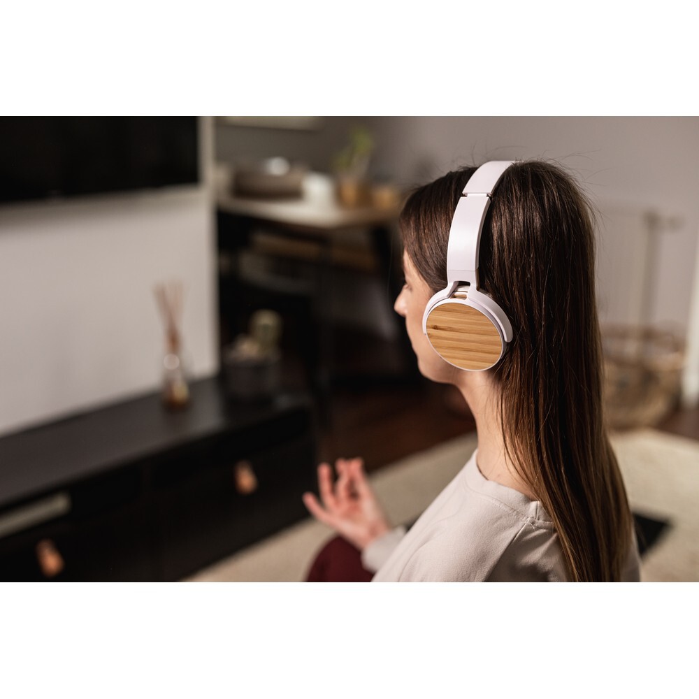 Nauszne słuchawki bezprzewodowe BT 5.0, bambusowe elementy, składane, bateria 200 mAh, czas pracy: 6-8 godzin, czas ładowania: 1-2 godzin, funkcja odbierania połączeń oraz czytnik kart TF (nie dołączona), wbudowany mikrofon, wejście audio, zasięg do 10 m, ładowane przez USB, kabel micro USB w komplecie