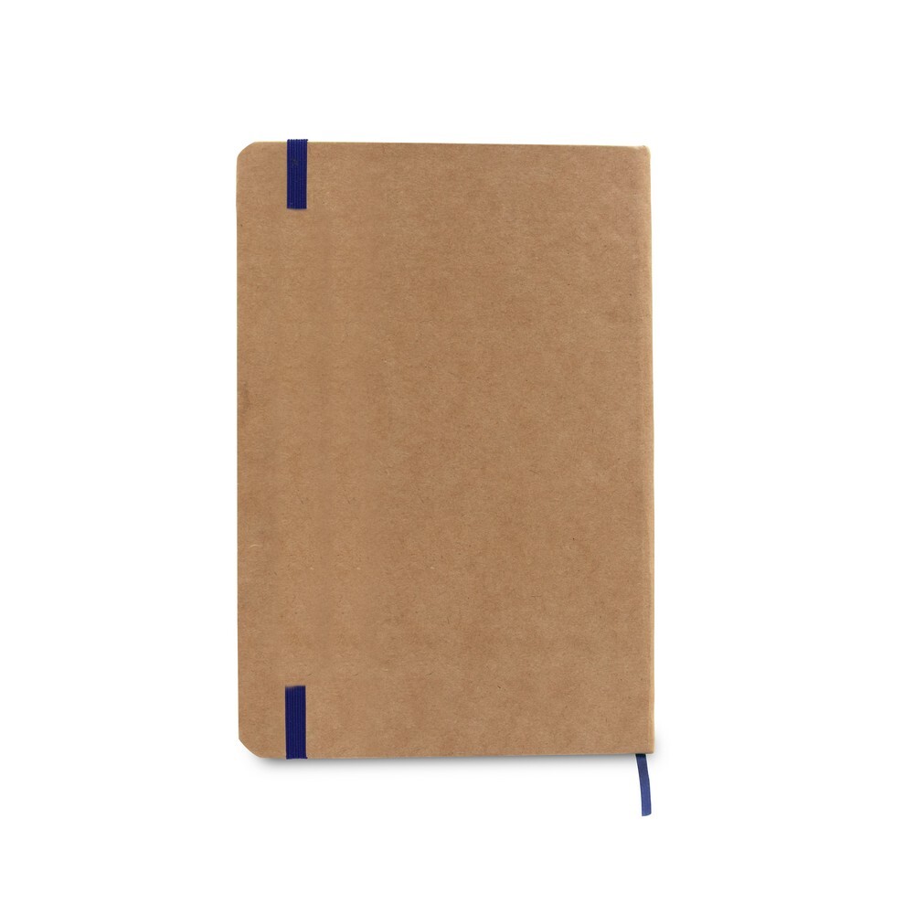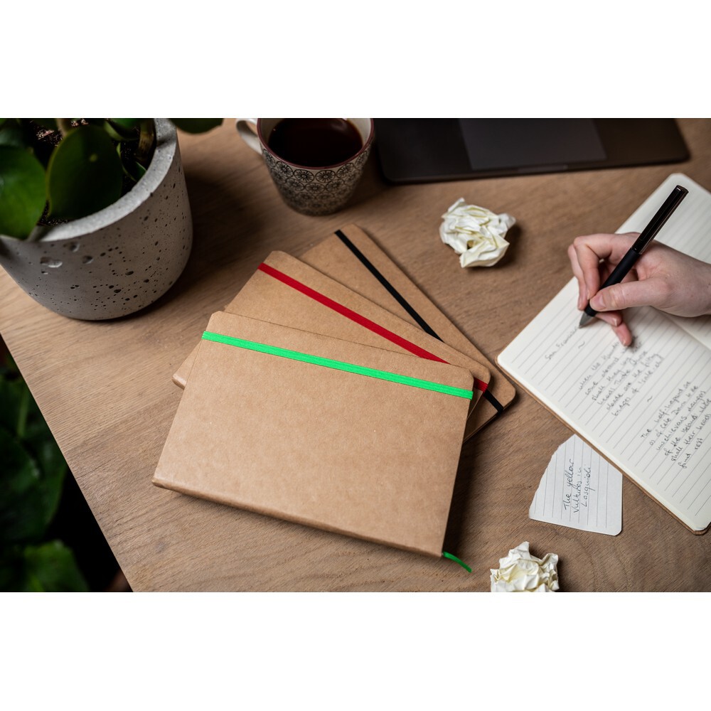 Notatnik (ok. A5, 96 kremowych kartek 70 g/m2 w linie), wykonany z papieru makulaturowego, twarda okładka, tasiemka zakładkowa, elastyczna opaska do zamykania