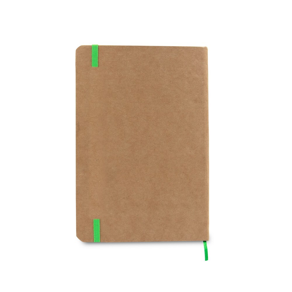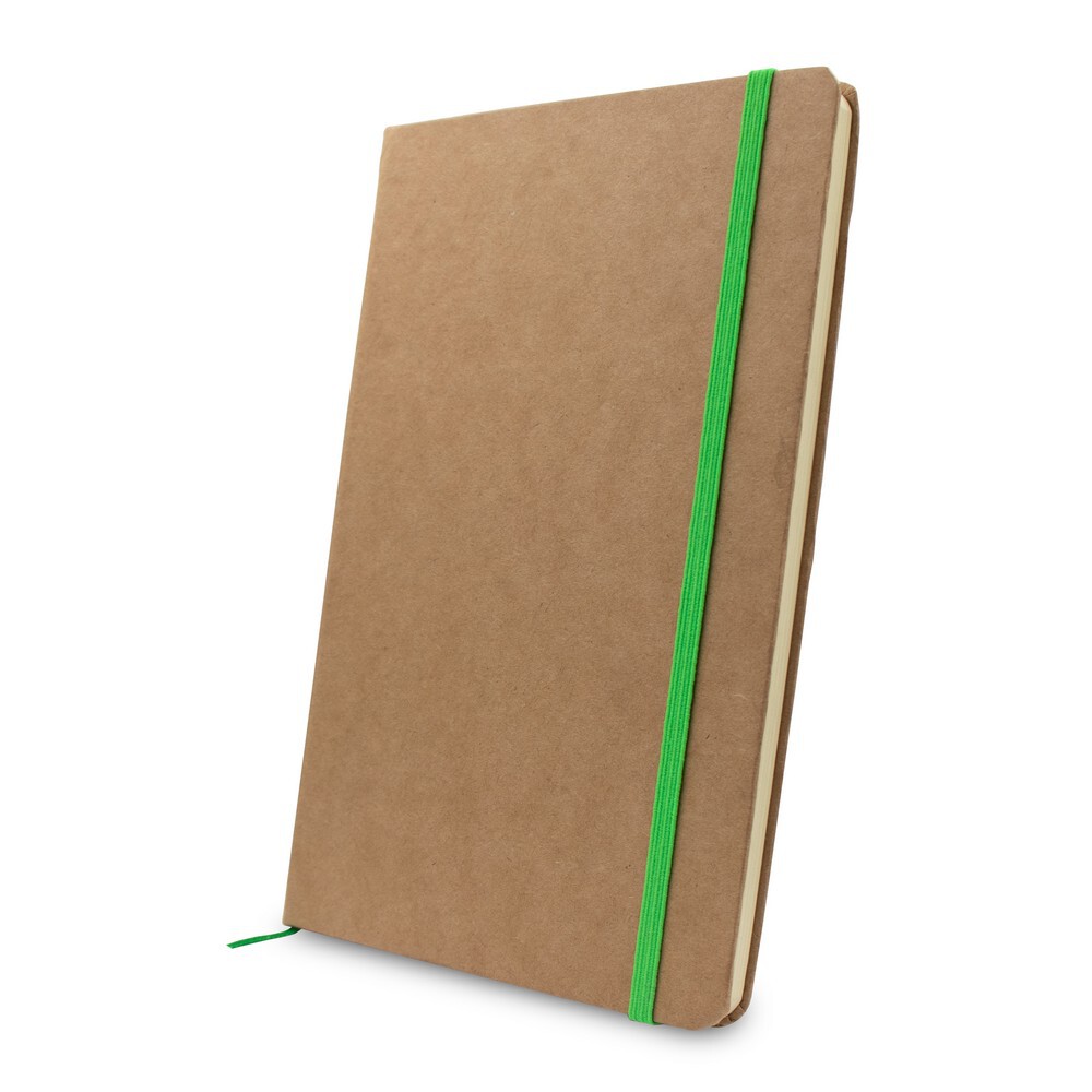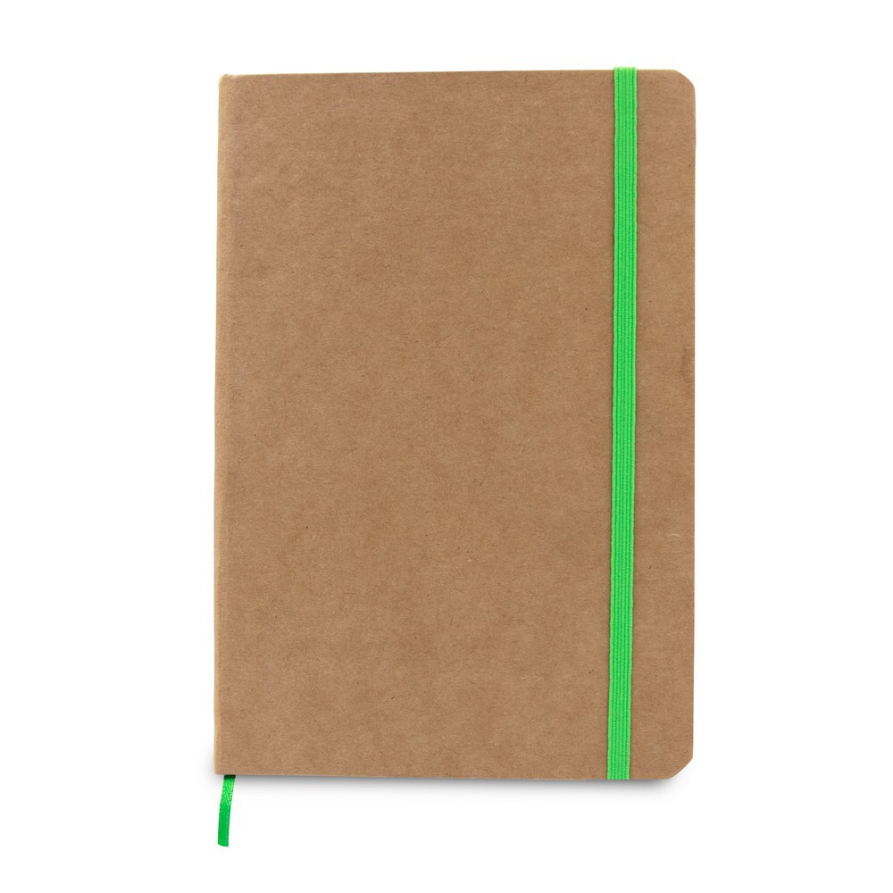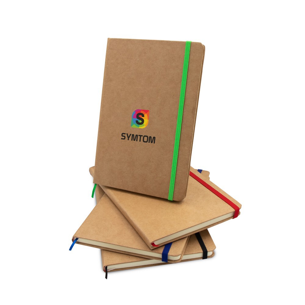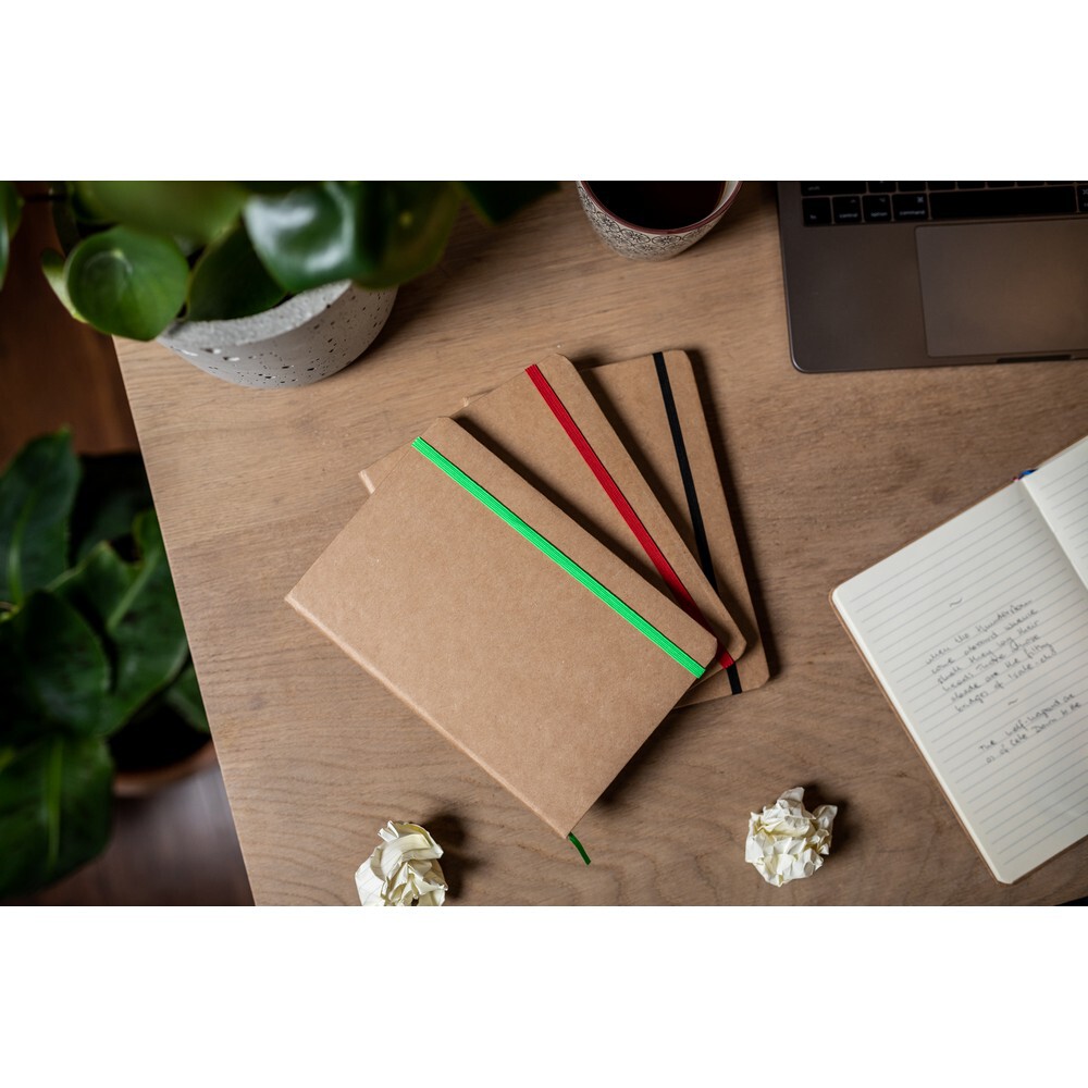 Notatnik (ok. A5, 96 kremowych kartek 70 g/m2 w linie), wykonany z papieru makulaturowego, twarda okładka, tasiemka zakładkowa, elastyczna opaska do zamykania