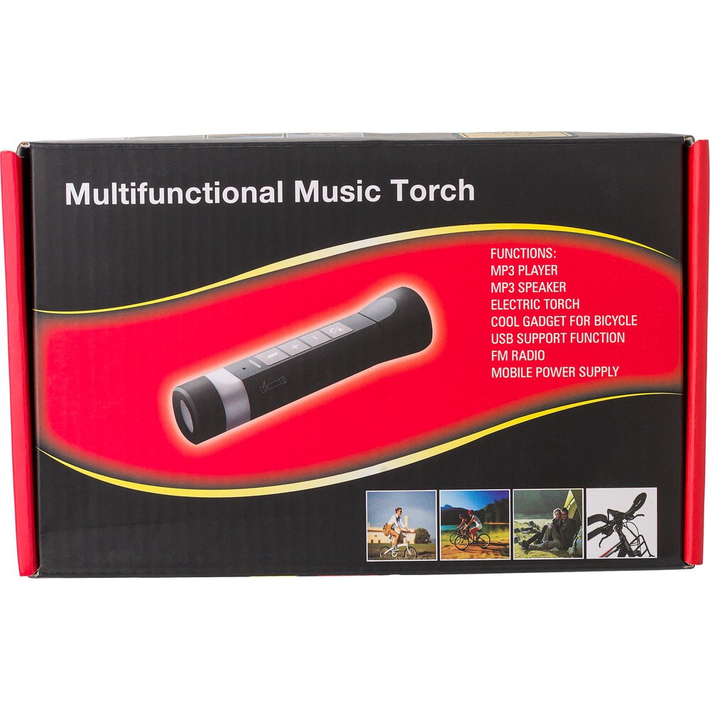 Wielofunkcyjna latarka LED, bezprzewodowy głośnik BT 5.0, power bank, uchwyt rowerowy oraz kabel do ładowania w komplecie