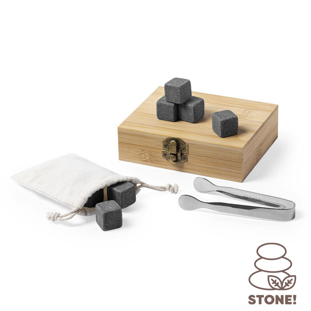 Zestaw chłodzących kostek do napojów z naturalnego kamienia ze szczypcami, 9 el., w bambusowym pudełku, kostki w woreczku ze sznurkiem