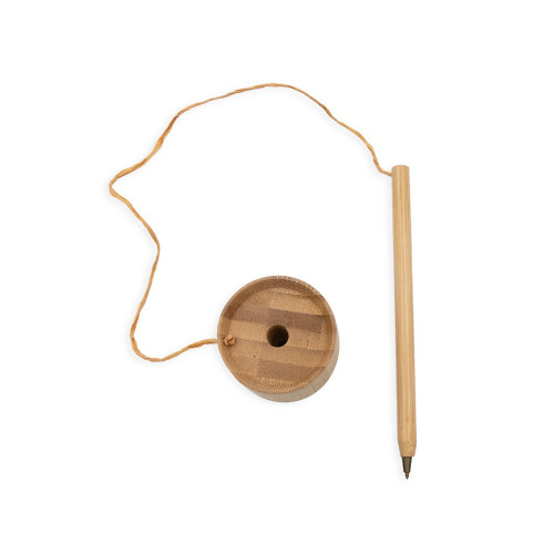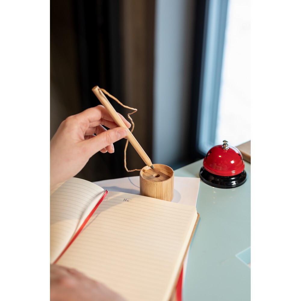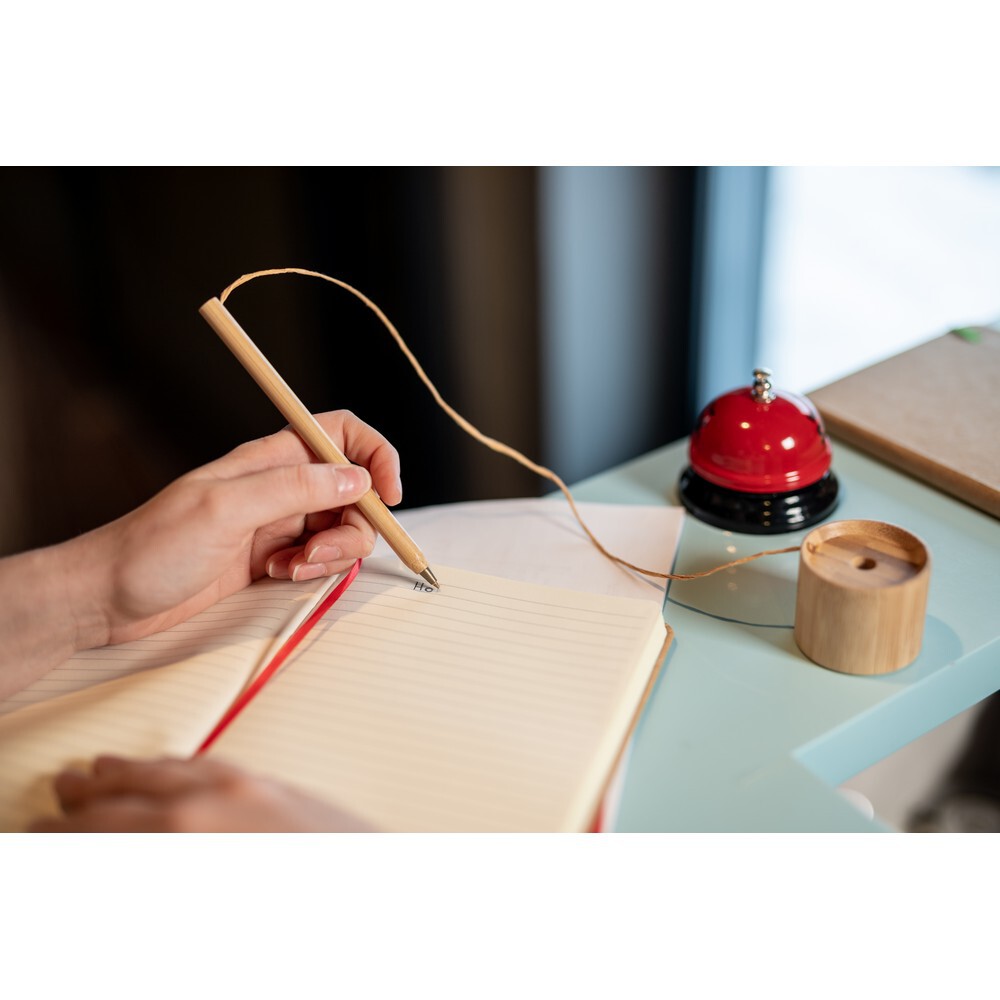 Bambusowy długopis ze stojakiem B'RIGHT, mocowanie na taśmę samoprzylepną, długopis połączony ze stojakiem naturalnym sznurkiem (33 cm)