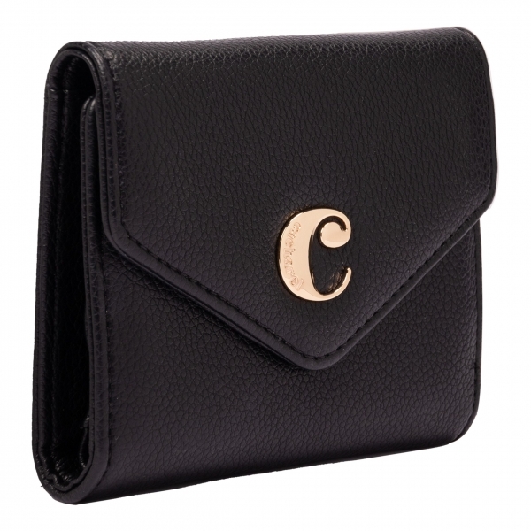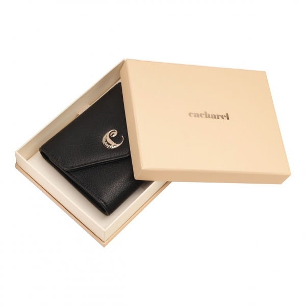Portfel `Alma` firmy Cacharel w kolorze czarnym wykonany jest ze starannie wyselekcjonowanej gładkiej skóry licowanej (PU). Produkt sygnowany jest tabliczką Carachel, z nieco powiększoną i wypukłą wersją kultowego logo z literką „C”. Portfel został zaprojektowany tak, aby był zarówno kompaktowy, jak i przenośny, z wieloma przegródkami, aby najlepiej zorganizować wszystkie niezbędne rzeczy: zawiera wiele przegródek na karty, woreczek na monety i 2 przegródki na banknoty. Model występuje w wielu pięknych kolorach.