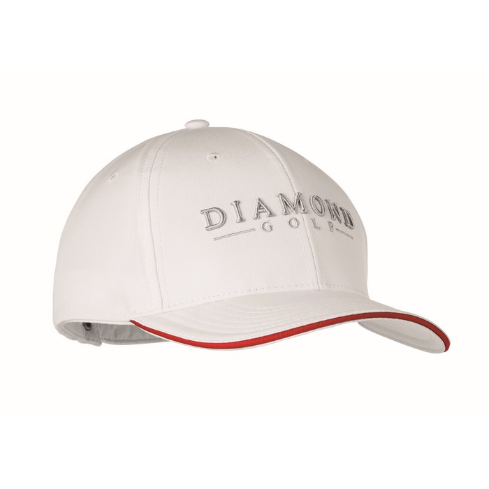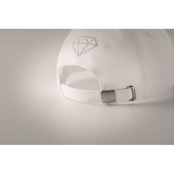 6 paneli, średni profil. Zakrzywiony daszek z przekładką i poliestrowym potnikiem. Zapięcie na metalową sprzączkę z zakładką w rozcięciu.