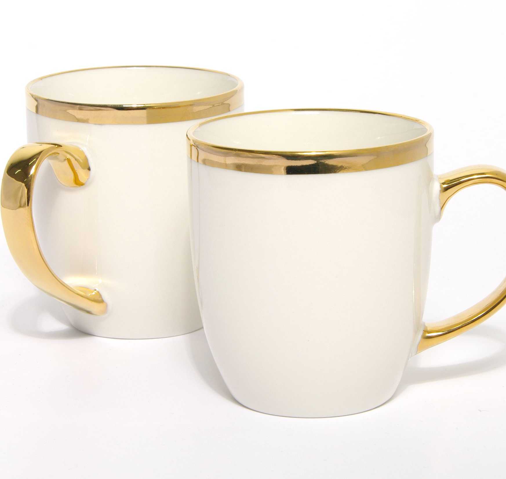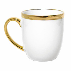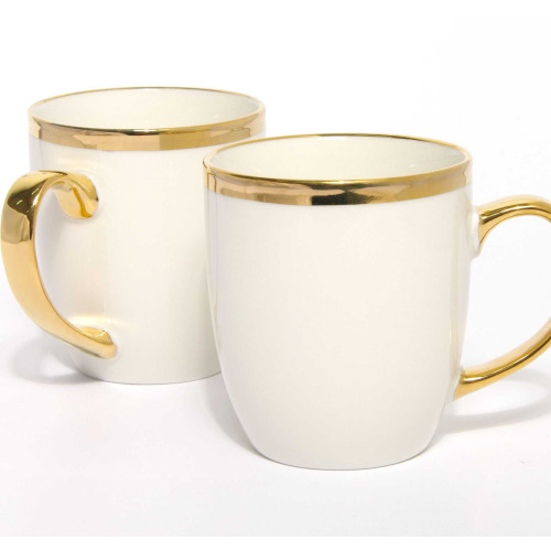 Kubek z ręcznie malowanym wykończeniem prawdziwym złotem, wykonany z porcelany new bone china, o lekko kremowym odcieniu bieli.