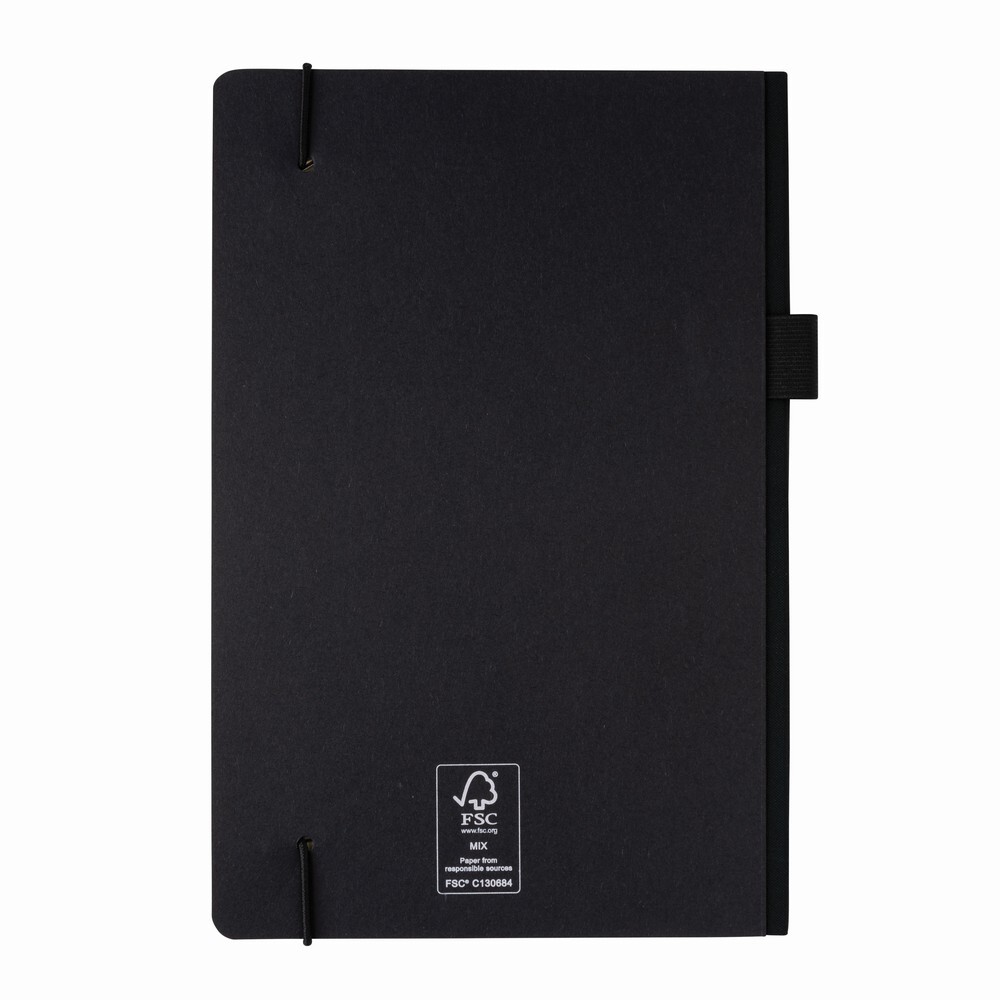 Notatnik A5, (80 kremowych kartek w linie), twarda okładka, okładka oraz strony wewnętrzne posiadają certyfikat FSC® (Forest Stewardship Council), tasiemka zakładkowa, elastyczna pętla na długopis, z tyłu kieszonka na luźne notatki