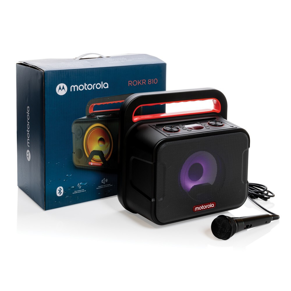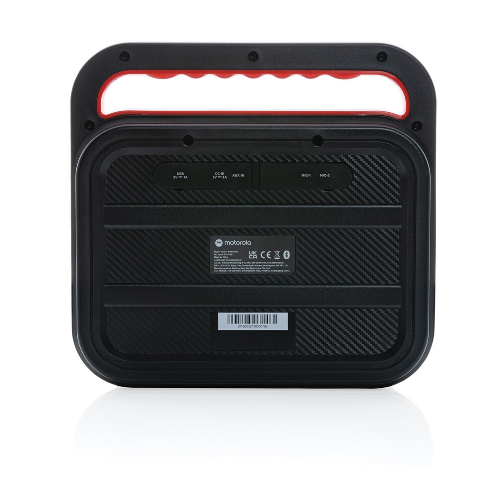 Głośnik bezprzewodowy 40W, BT 5.0, funkcja karaoke, wbudowany głośnik niskotonowy zapewnia doskonały dźwięk i głębokie basy, wbudowane podświetlenie LED w 6 różnych kolorach migające w rytm muzyki, mikrofon karaoke AUX w komplecie, zintegrowany uchwyt, wejście AUX, czas odtwarzania do 20 godzin, w pudełku prezentowym Motorola