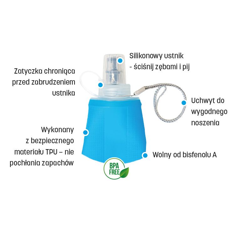 - wykonany z bezpiecznego tworzywa TPU – bidon nie pochłania zapachów, nie wpływa na smak wody, jak również jest w pełni bezpieczny zdrowia. Zastosowane materiały są odporne na uszkodzenia, znacznie przedłużając trwałość bukłaka.