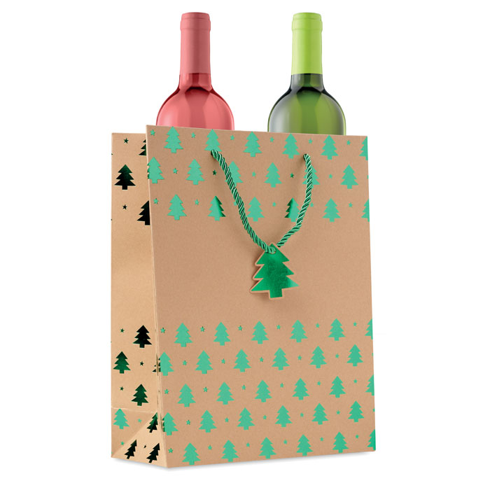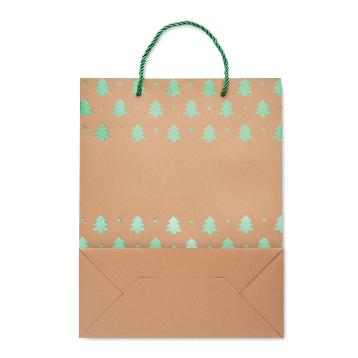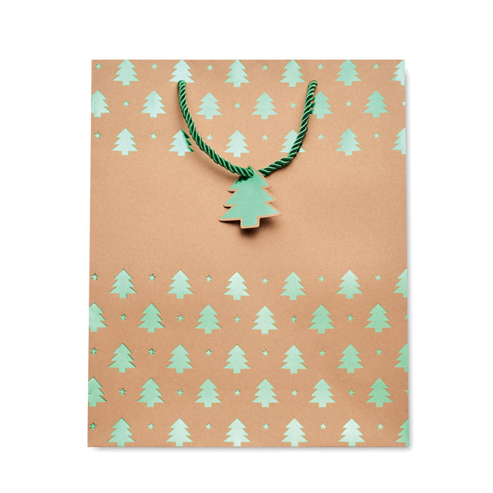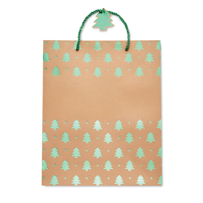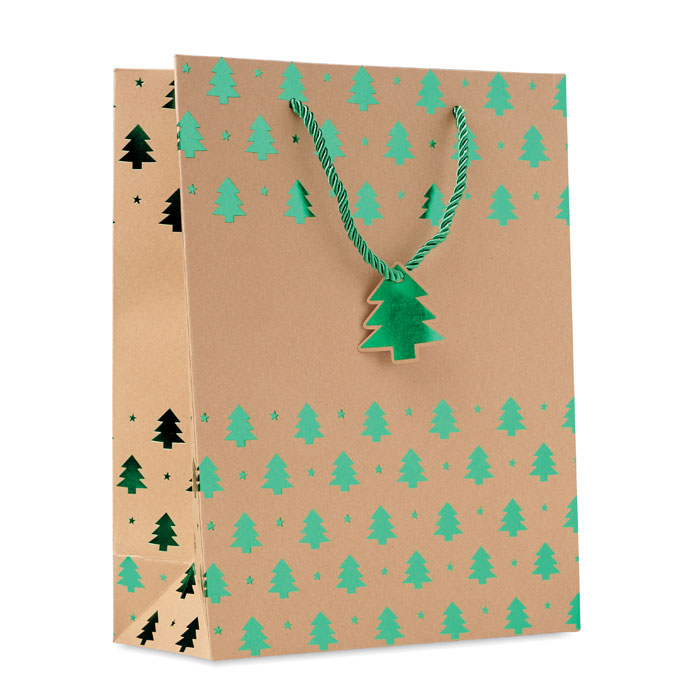 Elegancka torba papierowa z papieru kraft na prezent z sezonowym wzorem. Dołączona zawieszka. 250 gr/m².