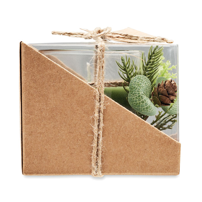 Szklany świecznik (120 gr) z aranżacją leśną. Zapakowany w karton i pudełko PVC, ze sznurkiem jutowym i etykietą z papieru kraft.