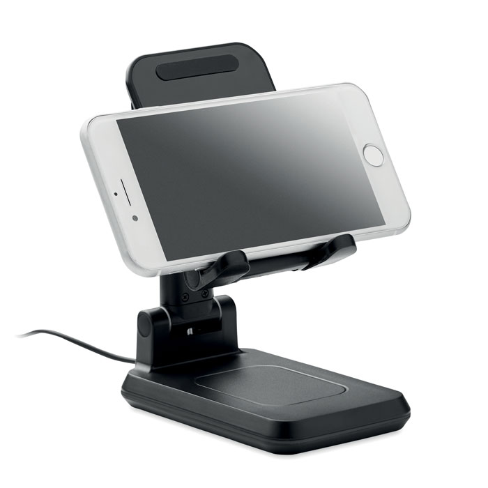Bezprzewodowa ładowarka 15W z ABS dla 1 urządzenia, z wysuwanym i składanym uchwytem na smartfon i z podstawką. Wyjście: DC 9V/1,67A (15W) do szybkiego ładowania. Kompatybilna z najnowszymi systemami Android, iPhone® 8, X i nowszymi.