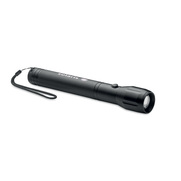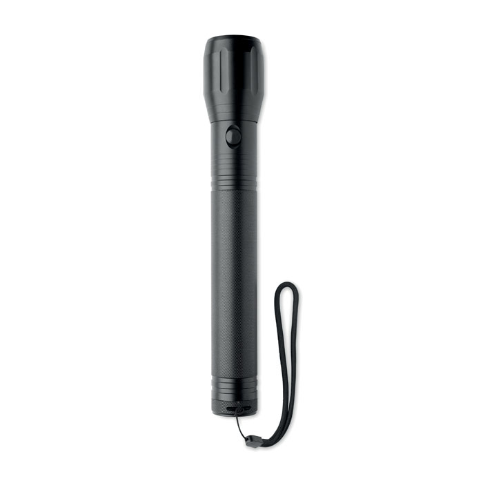 Duża aluminiowa latarka z 1 diodą LED, z możliwością powiększenia i z odczepianym paskiem. Moc światła: 300 lumenów. 3 baterie D nie są dołączone.