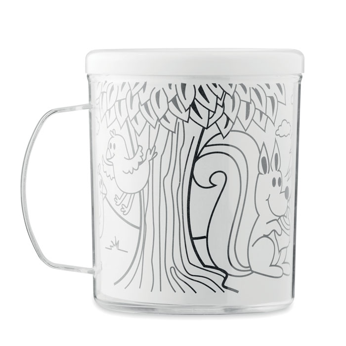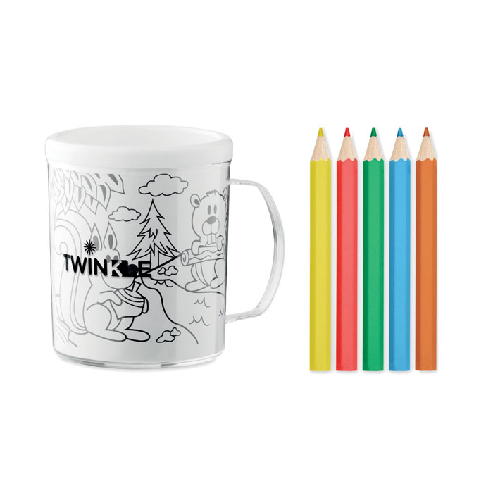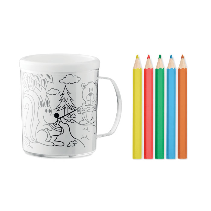 Kubek z tworzywa PS z 5 kolorowymi kredkami, zawiera 4 wzory do kolorowania.
