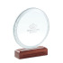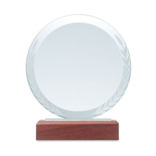 Okrągła kryształowa nagroda lub tabliczka pamiątkowa na drewnianej podstawie z drewna bukowego, w pudełku upominkowym.