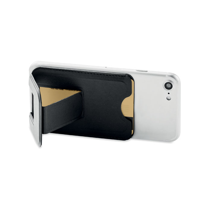 Etui na karty kredytowe z PU, z magnetycznym zamknięciem i funkcją stojaka na telefon, z taśmą 3M na odwrocie.