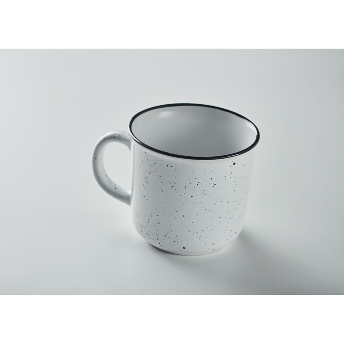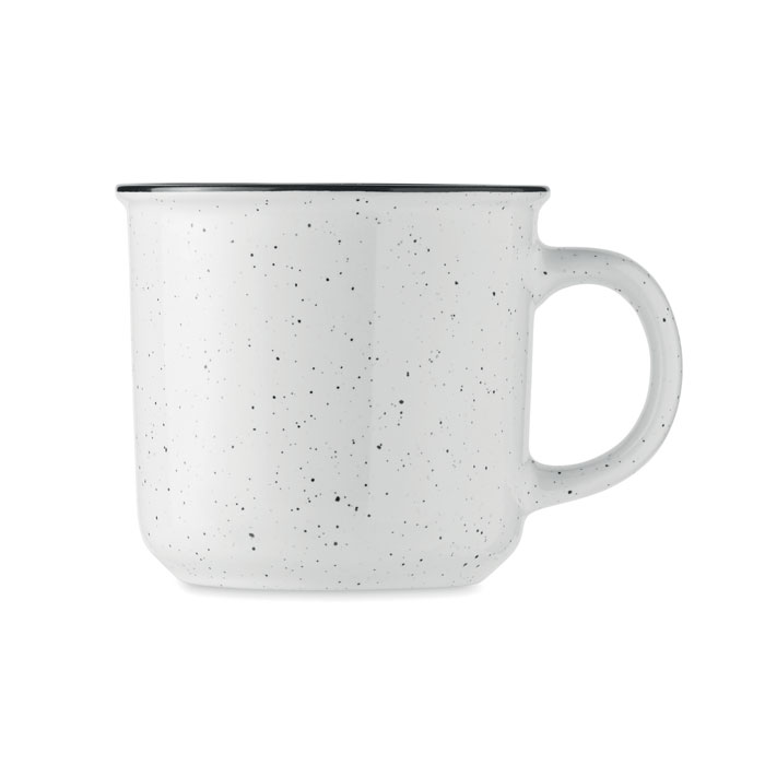 Duży ceramiczny kubek w stylu vintage. Ze względu na nakrapiany wzór, na nadrukowanym logo będą widoczne plamki. Pojemność: 400 ml.
