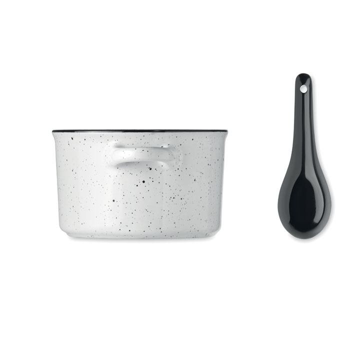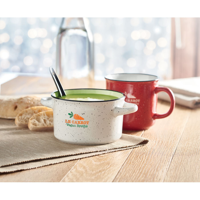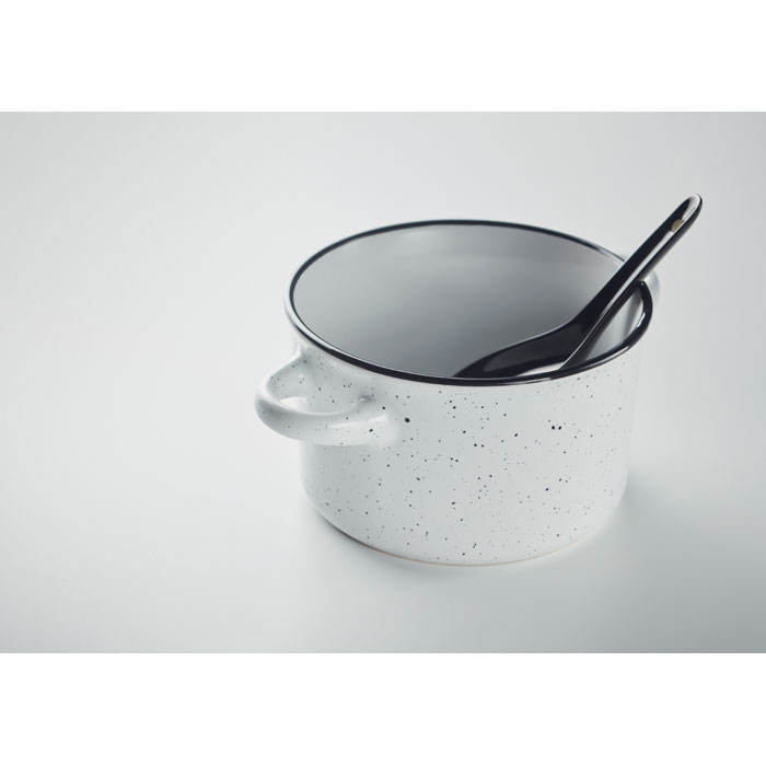 Ceramiczna miska do zupy w stylu vintage z łyżką. Ze względu na nakrapiany wzór, na nadrukowanym logo będą widoczne plamki. Pojemność: 550 ml.